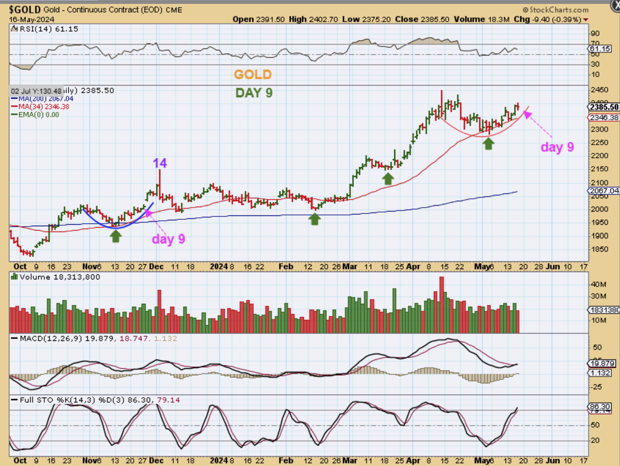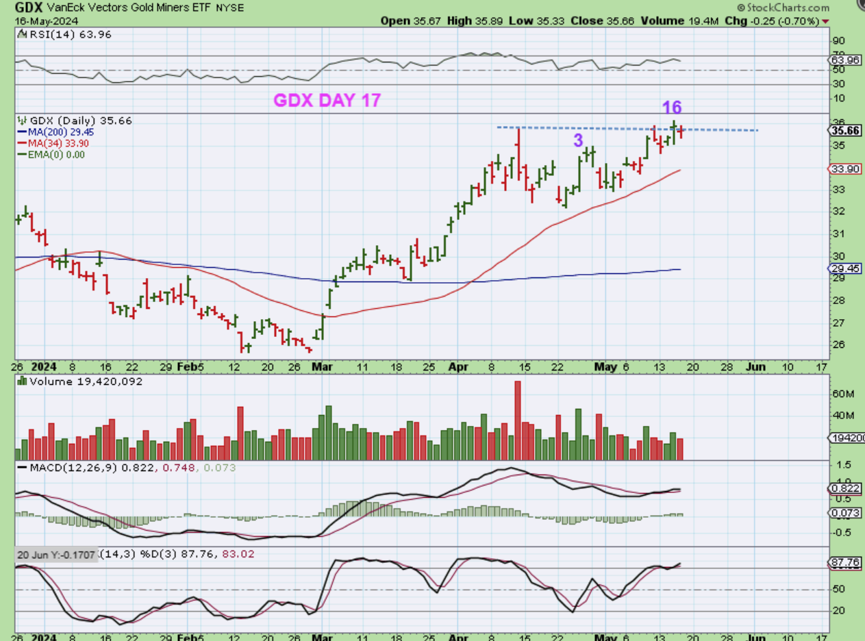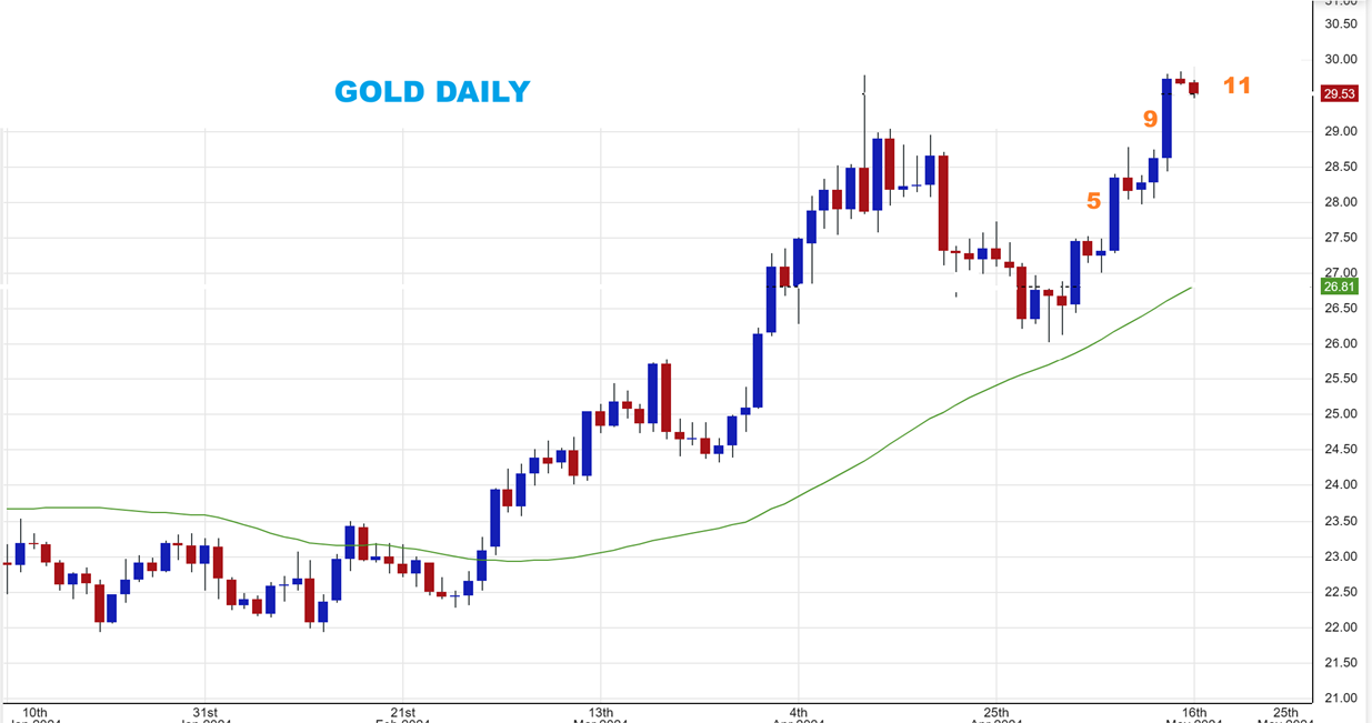 SILVER (NOT GOLD) – Silver is near the recent highs and is on day 11.