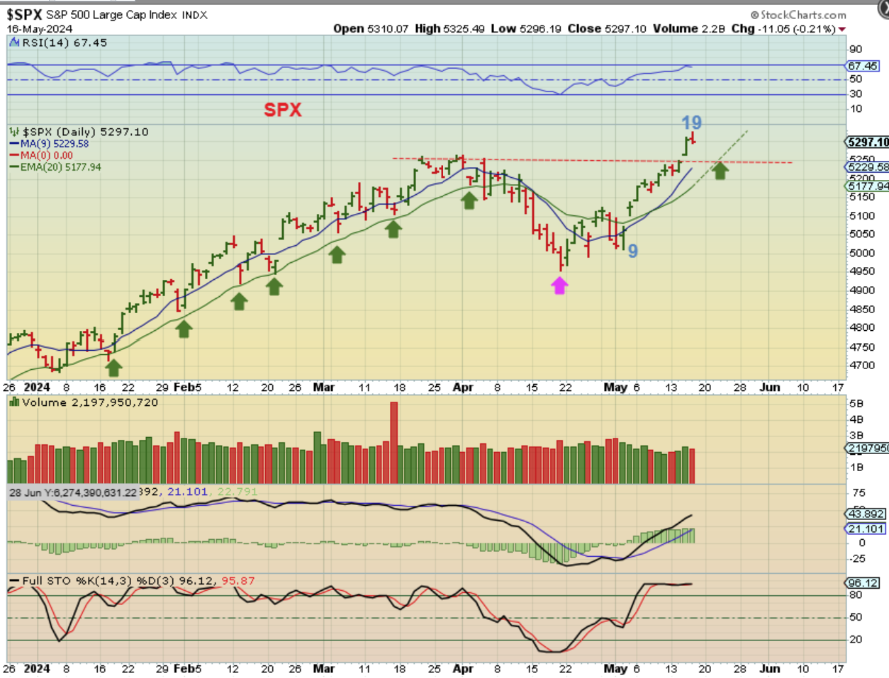 SPX – We have a ‘pause’ at day 19, so there is a chance that we will dip lower and back test the breakout and 10sma or the 20 ema. It would be a buying opportunity on a reversal of that selling, if the selling gets a little more downside.
