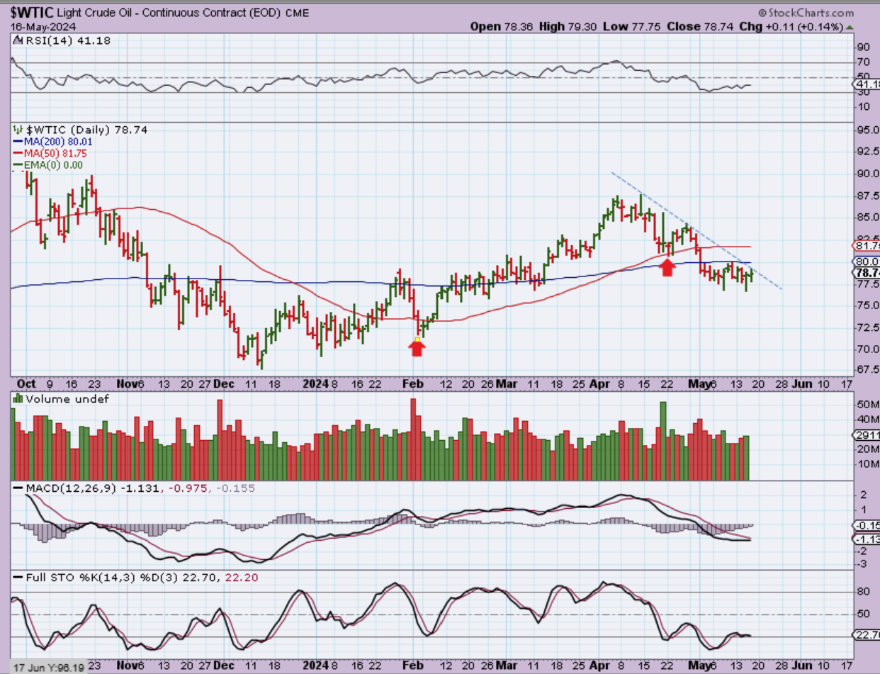 WTIC – The distance from the Feb DCL and the April drop to the 50sma was perfect timewise. Oil is at a multi-resistance points and may have a hard time rising up from here. It is also in a downtrend now.