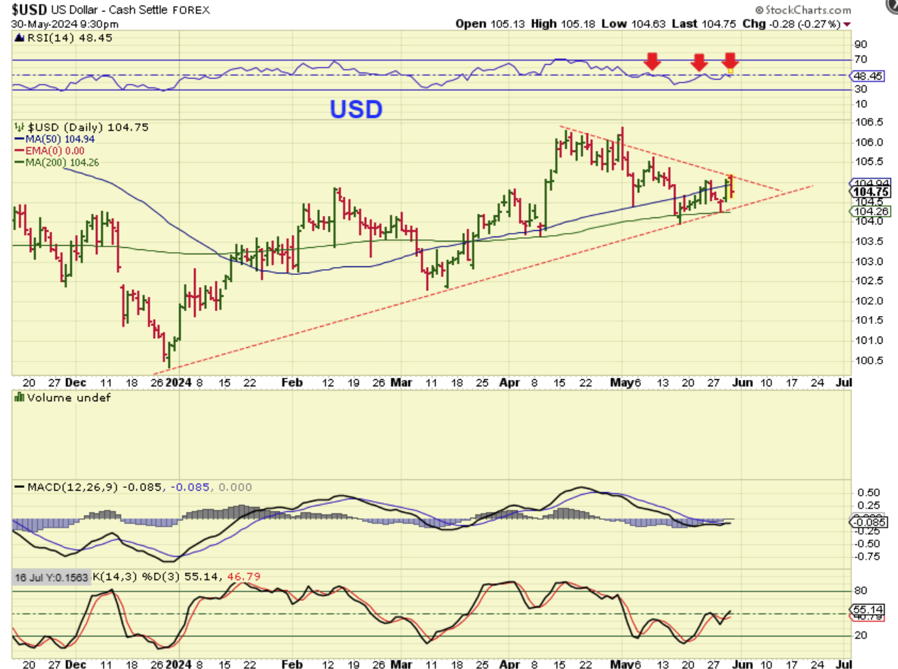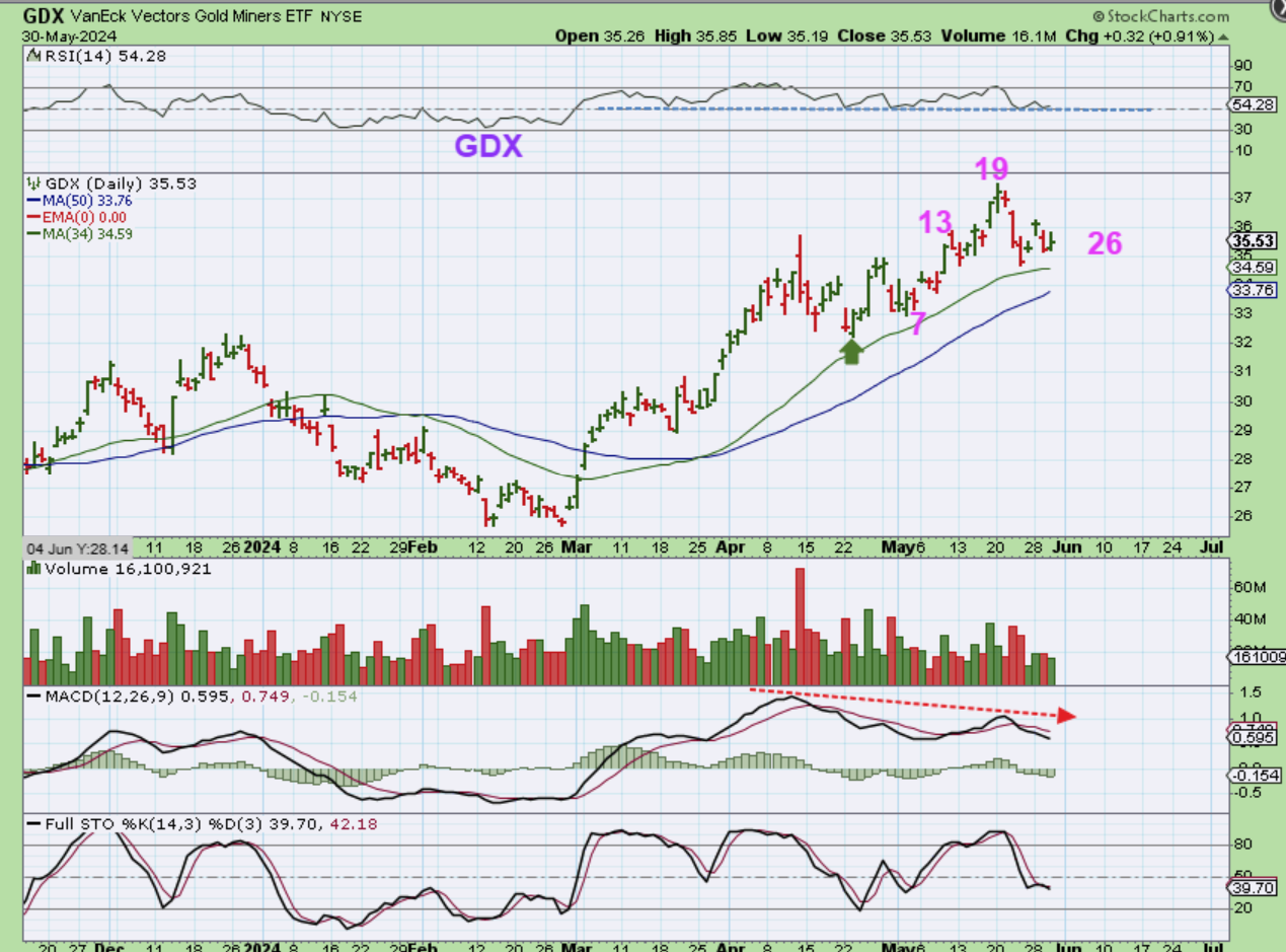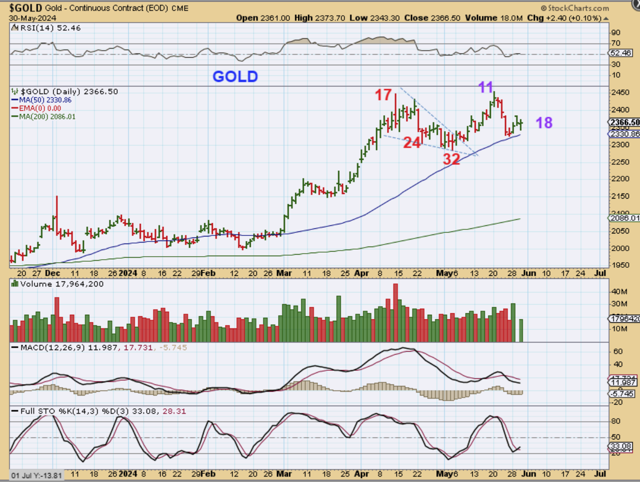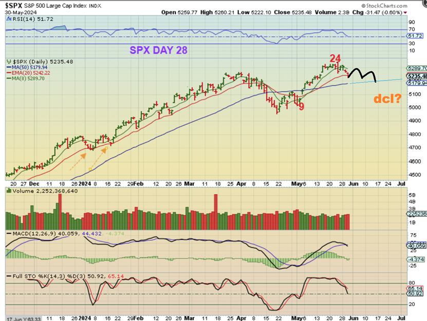 Important: I just want to mention that mentally I am trying to visualize where the Precious Metals Sector will be on June 12th, because that is the next Fomc Mtg. That is only 9 trading days away, so we COULD get a dcl after 8 or 9 days of choppiness. Let’s keep THAT in mind. If the drop is deep, it may be an ICL. I will discuss that in the weekend report.