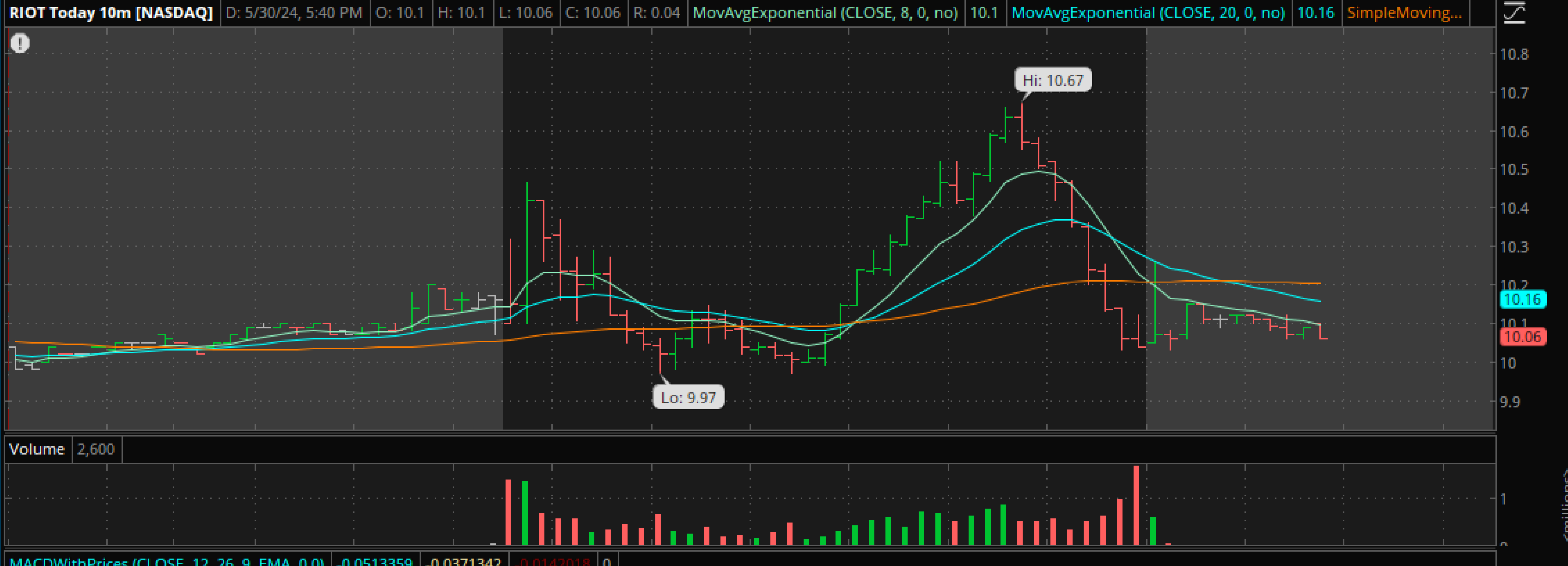 When BITCOIN ran up to that trendline yesterday, Crypto stocks took off higher, but when it failed to break out, they sold off just as quickly. This was RIOT as it ran from roughly $10 to $10.67….and back.