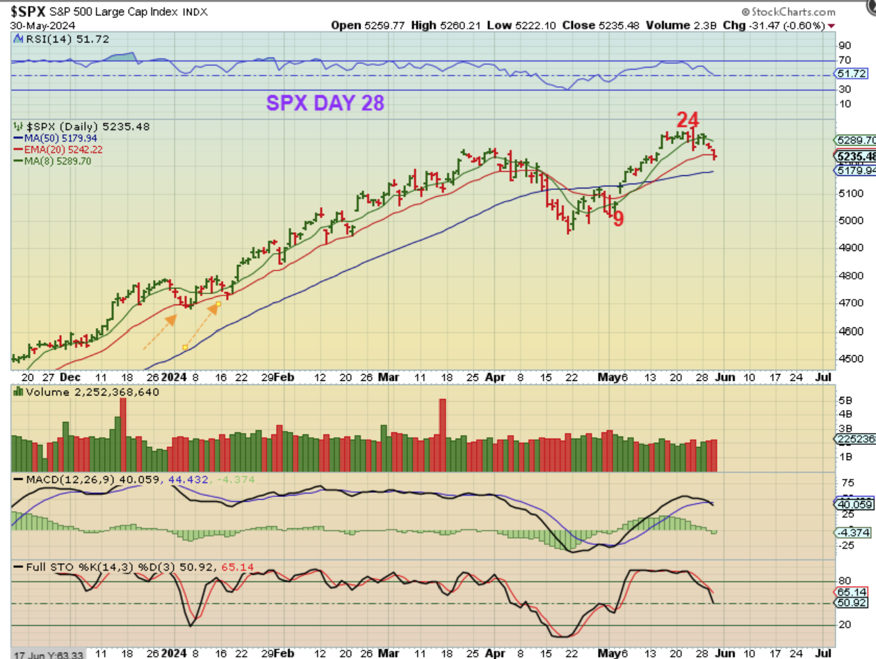 THE SPX has started that drop discussed in recent reports. Yesterday I showed how the DJIA was already dropping in harmony with the Transports. We also saw a bearish engulfing last week, so we were expecting that the markets might start to get ‘heavy’ and dip lower. So…