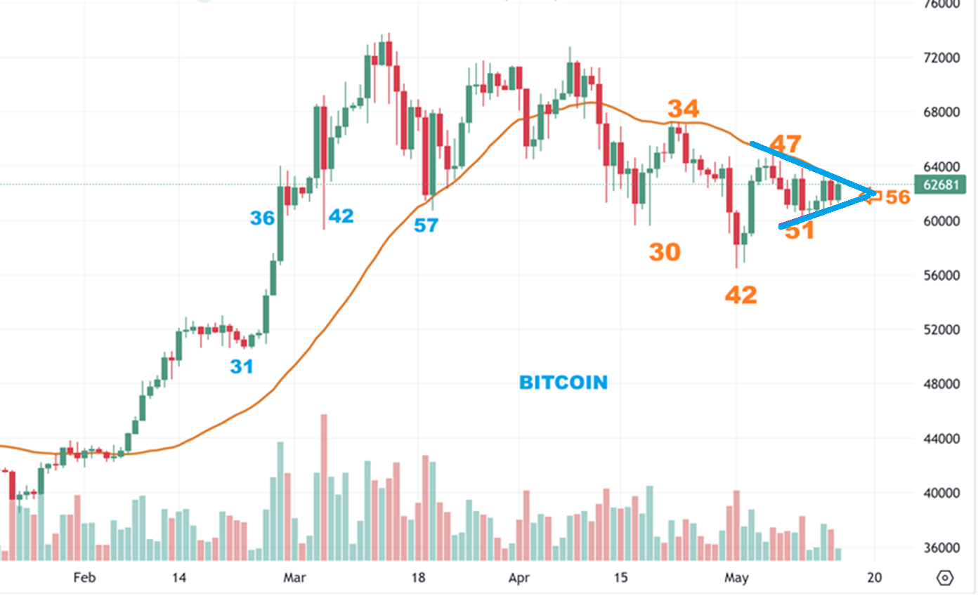 I mentioned that BITCOIN had formed a triangle by day 56, and I said,