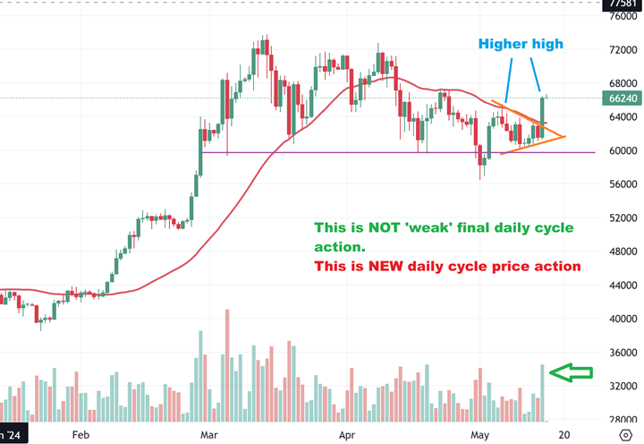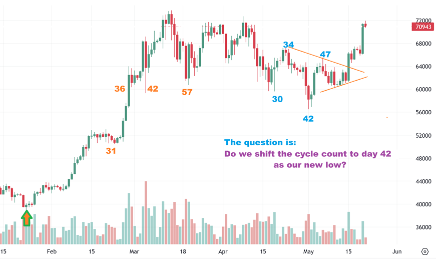 So: BITCOIN broke out and made a higher high and a higher low with that triangle, so a dcl was marked at the apex and now we can start another 60 day cycle, most likely higher. Next is the question that crossed my mind…