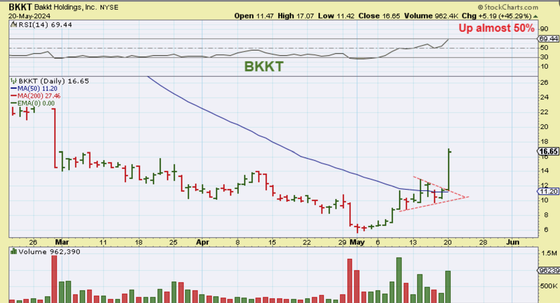 BKKT closed up almost 50%! I took a small starter position because it was choppy, so now I don’t know how I’ll add, unless we get a bull flag, a triangle, or a dip. That is something to watch for, because you can see that since May 1, this has already tripled! Buy the dip, but be reasonable, because these can surge up 50% and drop 20% – Keep it small at first.