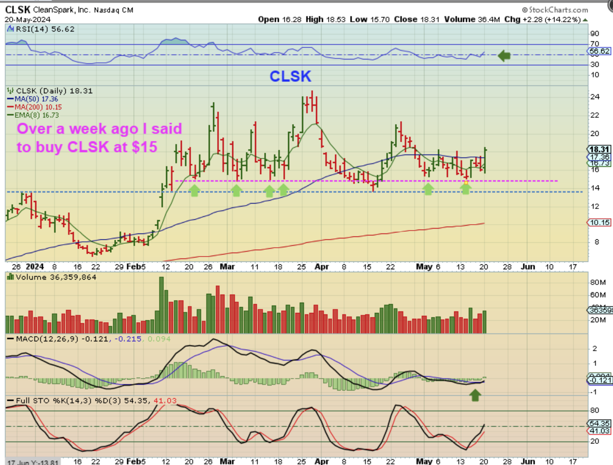 CLSK Over a week ago I pointed out that CLSK was a buy in the $15 area, and had strong earnings. It gained 14% yesterday.