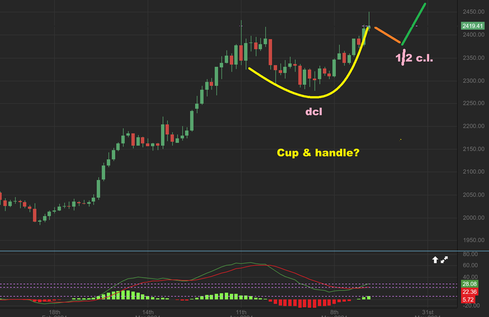 2. Instead of just calling a top, we may get a dip into a half cycle low and then a continuation higher in this 3rd daily cycle, forming a small cup & handle, so we have to let it play out.
