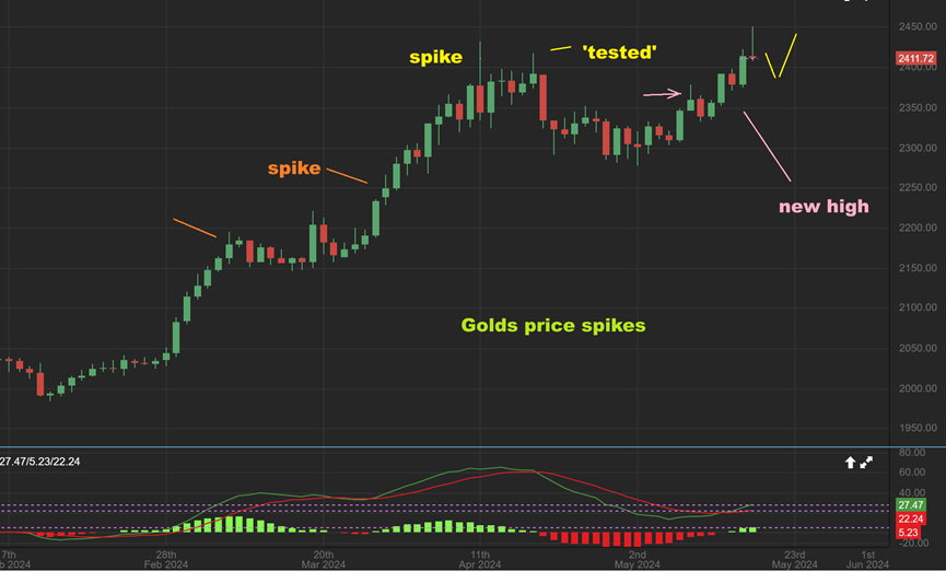GOLD #2 – I want to point out a couple of other areas where Gold spiked. On a couple of occasions, it did dip and sell down a little, but then it continued higher. In one case it just kept running higher, so for now it is a small spike and we’ll see how this one plays out from day 11,