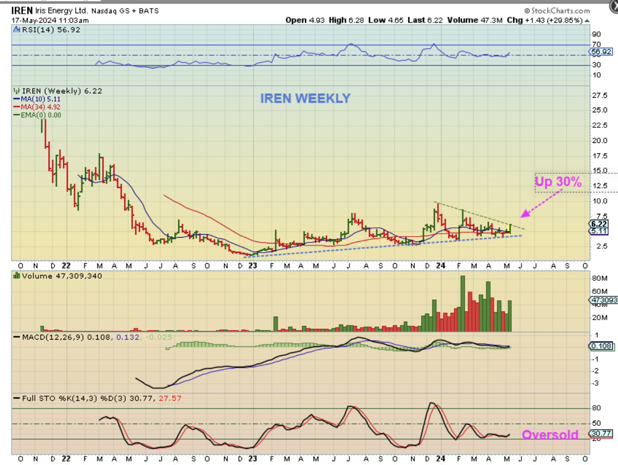 MARA was up over 16%, but closed up 14.76%. So this is a nice base that MARA is breaking from, with higher lows and higher highs in place. It is choppy and rough, but once these get going they often do run swiftly. I think that this does show us how these Crypto related stocks (MARA, RIOT, CLSK, HUT, HIVE, MSTR, IREN, BKKT, CIFR, BITF, BTBT, etc etc ) can run with Bitcoin in this next daily cycle.