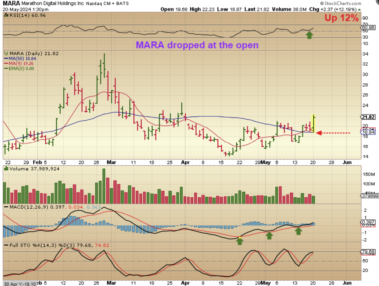 MARA dipped down to the 50sma and then reversed and turned green as Bitcoin moved higher yesterday, so I posted this in the commenting area within the first hour of trading & stated that many were doing this. A reversal at support is an easy buy, since your stop is under the support (50sma).