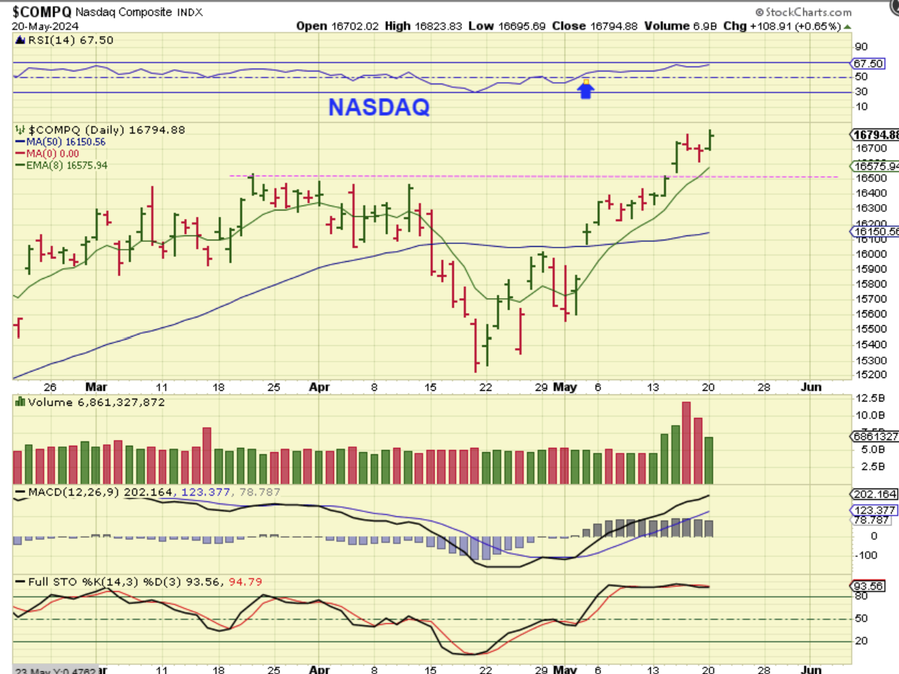 The NASDAQ made slightly new highs and held the days gains a little better than the SPX did. We are seeing a surge in volume with the Nasdaq that I am not seeing with the SPX. I would raise my stops, just in case this becomes distribution over time.