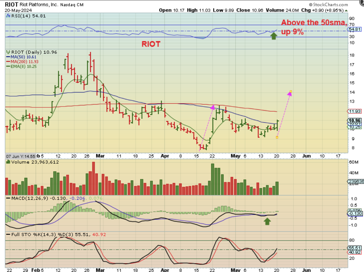 RIOT was up 9% and broke out above the 50sma. The 200sma is overhead and then it could run to the recent highs.
