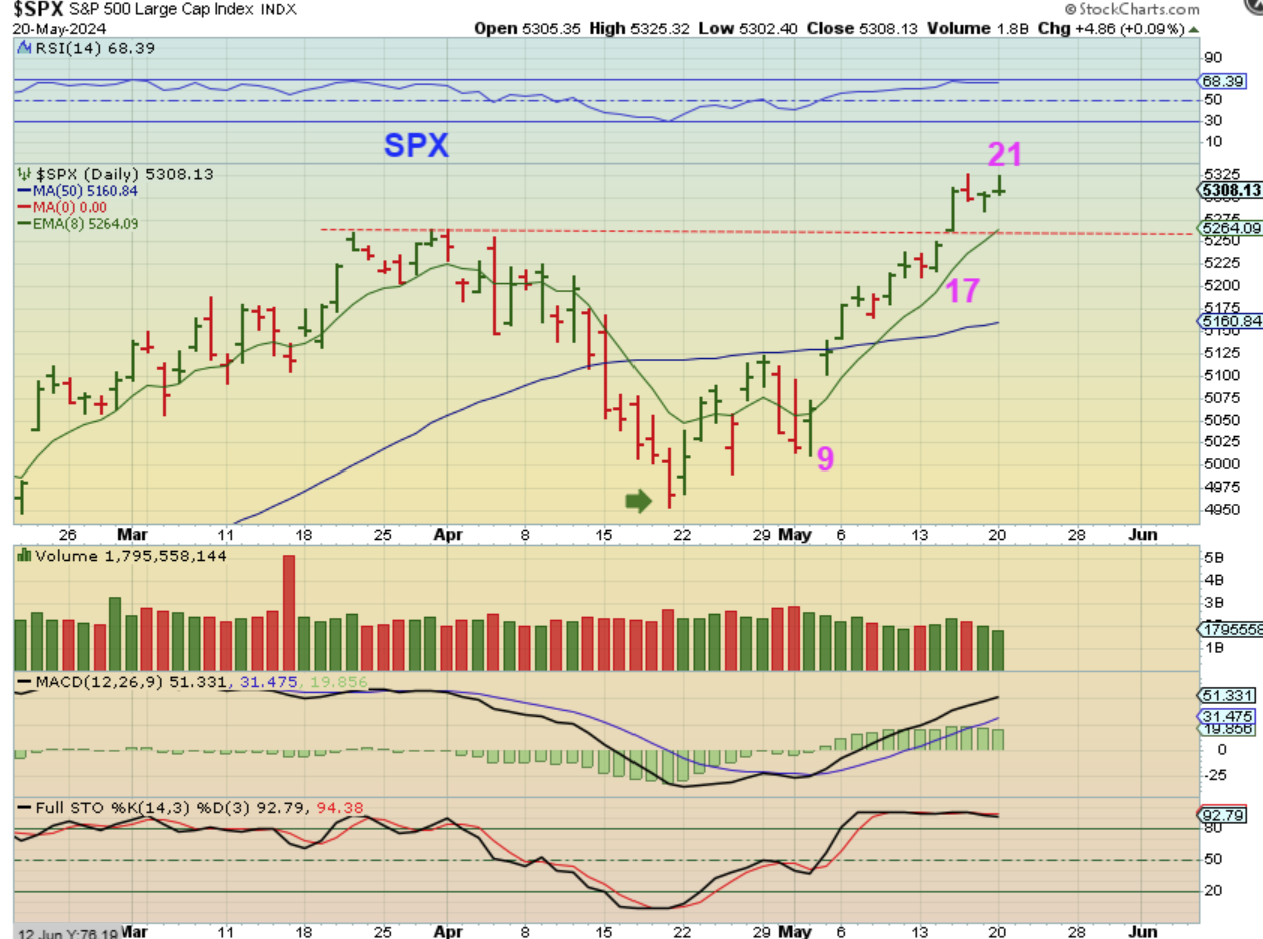 SPX– Day 21 and the markets have been moving pretty much straight up out of the ICL. We could see a pullback, a back-test of the breakout and 8 ema as a half cycle low, or this can continue higher for a little while more, but things remain bullish at this time. Raise stops and your gains are guaranteed.