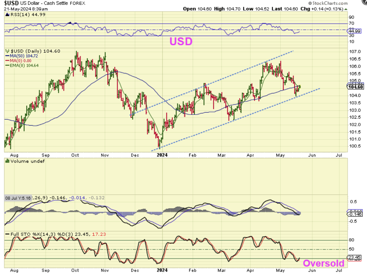 The USD lost the 50sma, but it has now reached the lower level of that channel, which is acting as support so far. This could be the dcl and a bounce will follow or is in progress. This bounce has NOT hurt Gold and Silver so far.