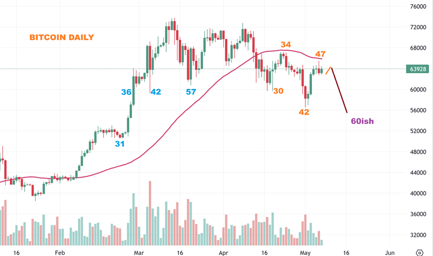 I know that the bitcoin day 30 & day 60 ‘counts’ has been very accurate in the past, it really has, but there just seems to be something about that last Fed Meeting that renewed the bullishness in these markets. We’ll just have to wait and see, but the General Markets were able to push above their 50sma after the Fed decision and speech. It would be very odd to me to see Bitcoin push above the 50sma from here without 1 more dip. The count from the January lows to a day 57 dcl is very obvious and accurate to me. The next 30 day 1/2 cycle low was clear too. A day 42 dcl would be pretty much unheard of, but I’ll be watching this development closely, since the Crypto-Stocks are an excellent trade opportunity.