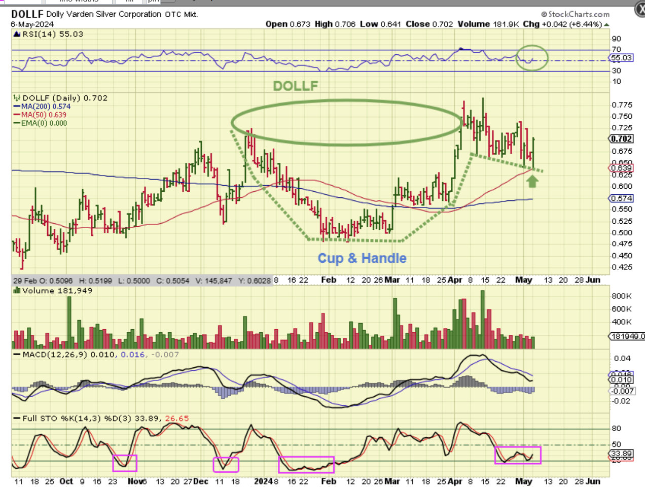 I was looking at a couple of the smaller Miners/ explorers, and noticed that DOLLF looks like a cup and handle after the last run and pullback. This is probably as low as this pullback will drop. It tagged the 50sma yesterday.