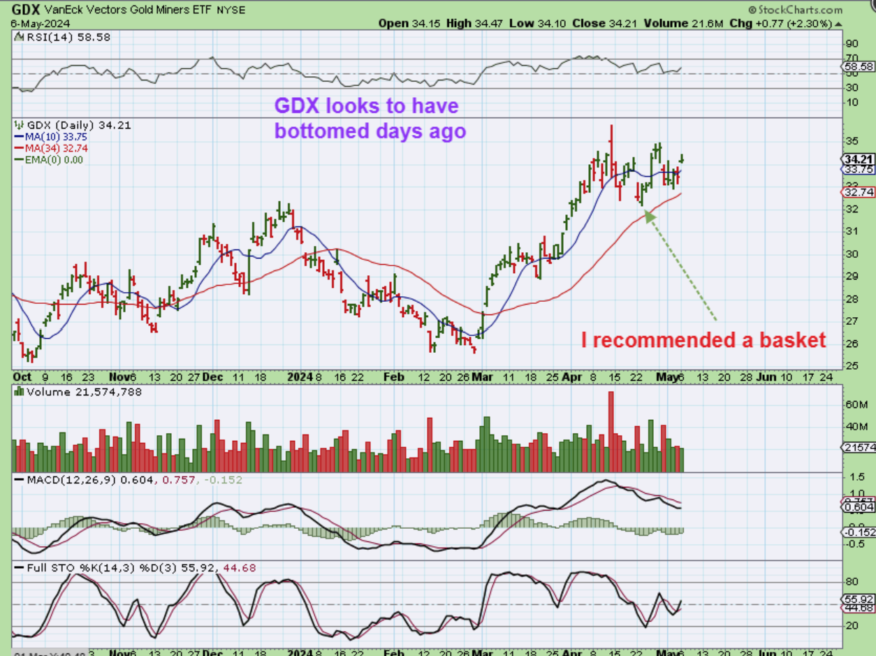 ON APRIL 26 –  I started to mention that buying a basket again seemed prudent, even though Gold & Silver didn’t bottom. Why? I pointed out that Miners were leading Gold with this chart. I also showed that IAG, KGC, NEM, NGD, and a few other stocks already looked to have bottomed.  Well…