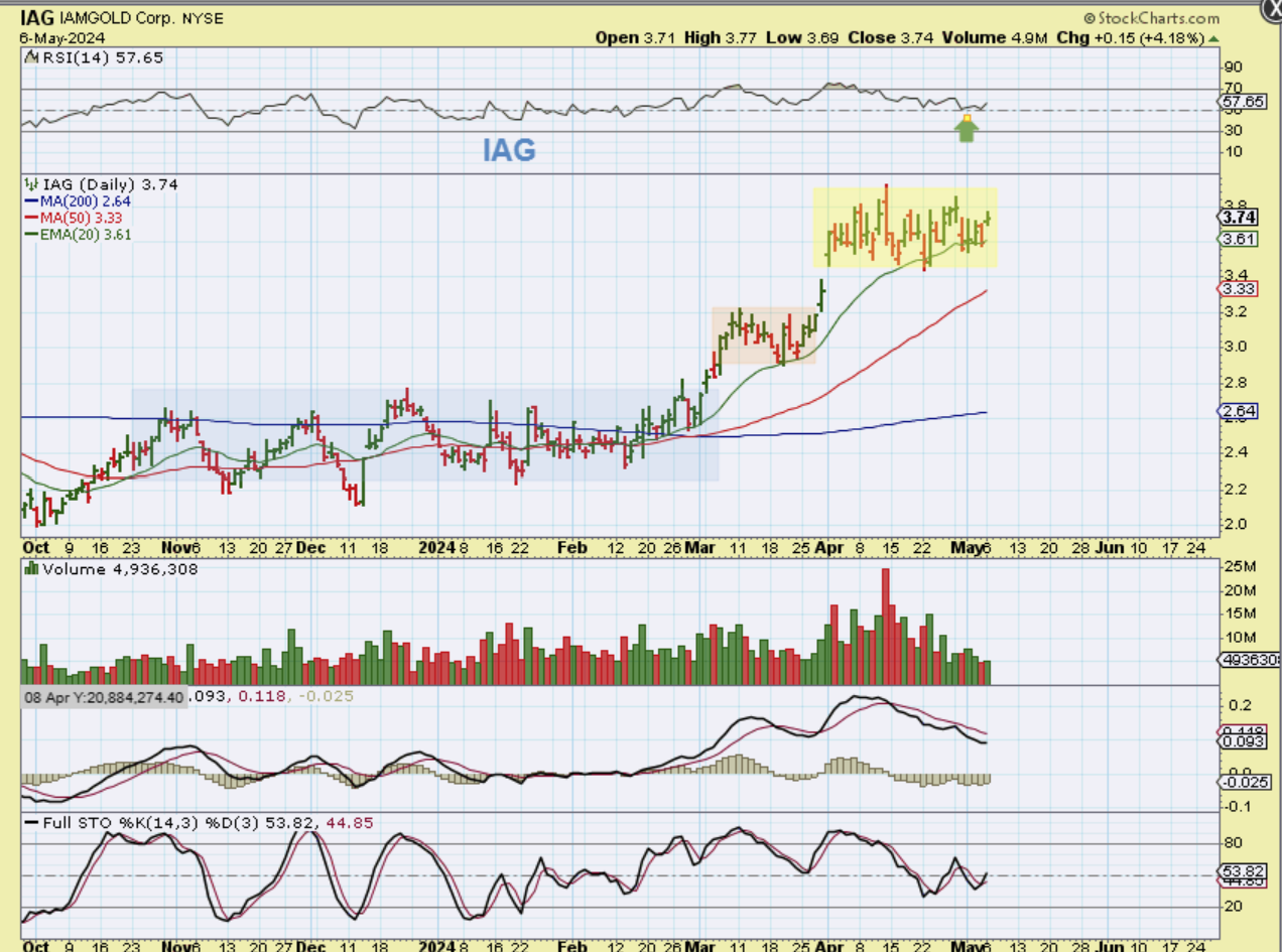 IAG in recent reports I have been pointing out that IAG, KGC, AEM, NGD, NEM, etc are already consolidating up near the highs, so the dip was mild for some Miners and buying a basket was recommended as of last Wednesday.
