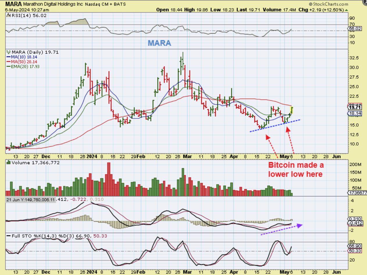 MARA put in a higher low. Also Mara was heading for the 50sma and was up 12.5% so I grabbed this chart and posted it in the comments, since many of these were showing strength, and…