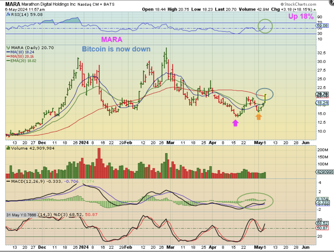 MARA actually broke above the 50sma , up 18% and it closed above the 50sma. The RSI is above the 50% mark and the MACD now has a higher cross over. These Crypto Stocks look to be bottoming before Bitcoin.