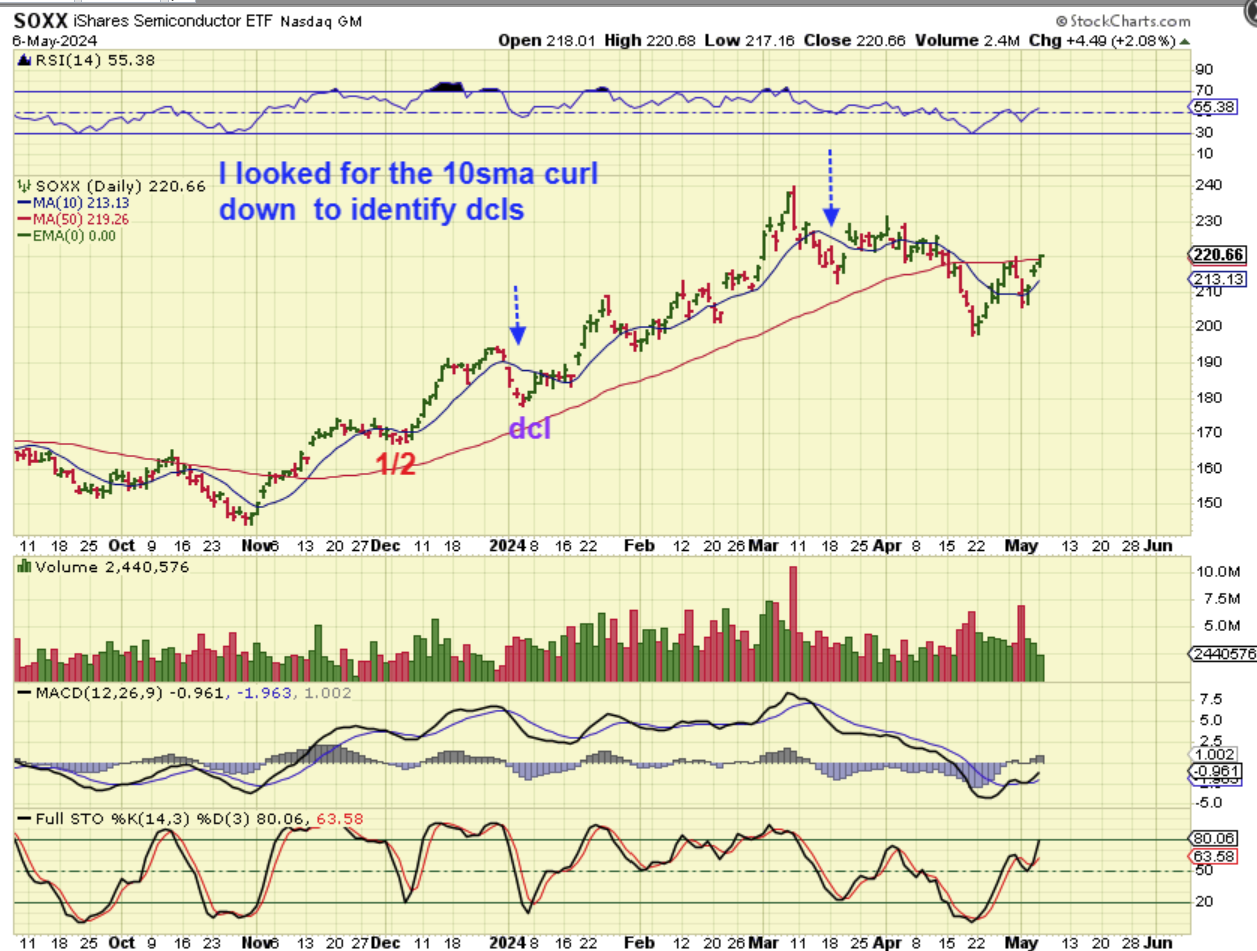 With The SOXX I only see the 10sma curl down twice and we usually use that to identify where a dcl took place. Using that last 10sma dip into a low, we would only be at day 22 at that low, and that is too early for a General Market dcl, but I can’t argue with what I see unfolding here. After the Fed mentioned no rate hikes and a possible cut in the future, the bounce to the 50sma found added strength.