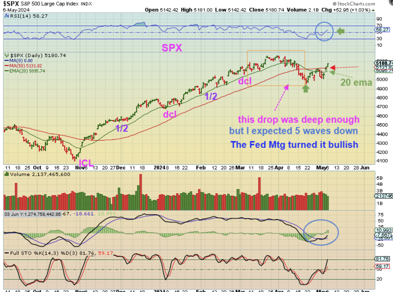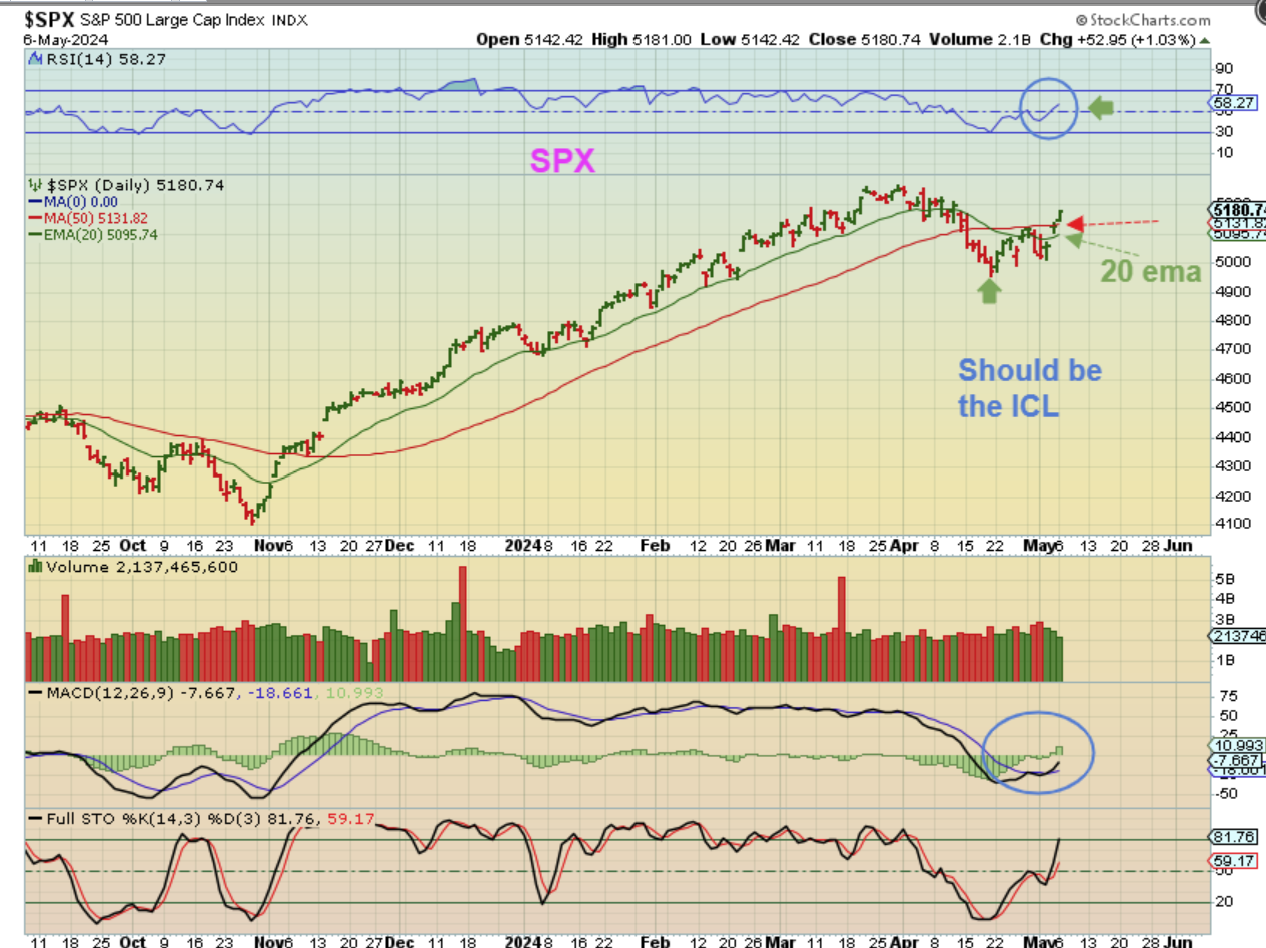 THE SPX did continue to push higher and was able to break above the 50sma & downtrend line. After a drop like that, we are now 6 months ahead of the last ICL, so that drop (far different from the prior smaller dcl dips), must have been one that leads us to the ICL. I expected a 5 wave drop, but thistrend line break and recapture of the 50sma is showing us that the drop has ended.