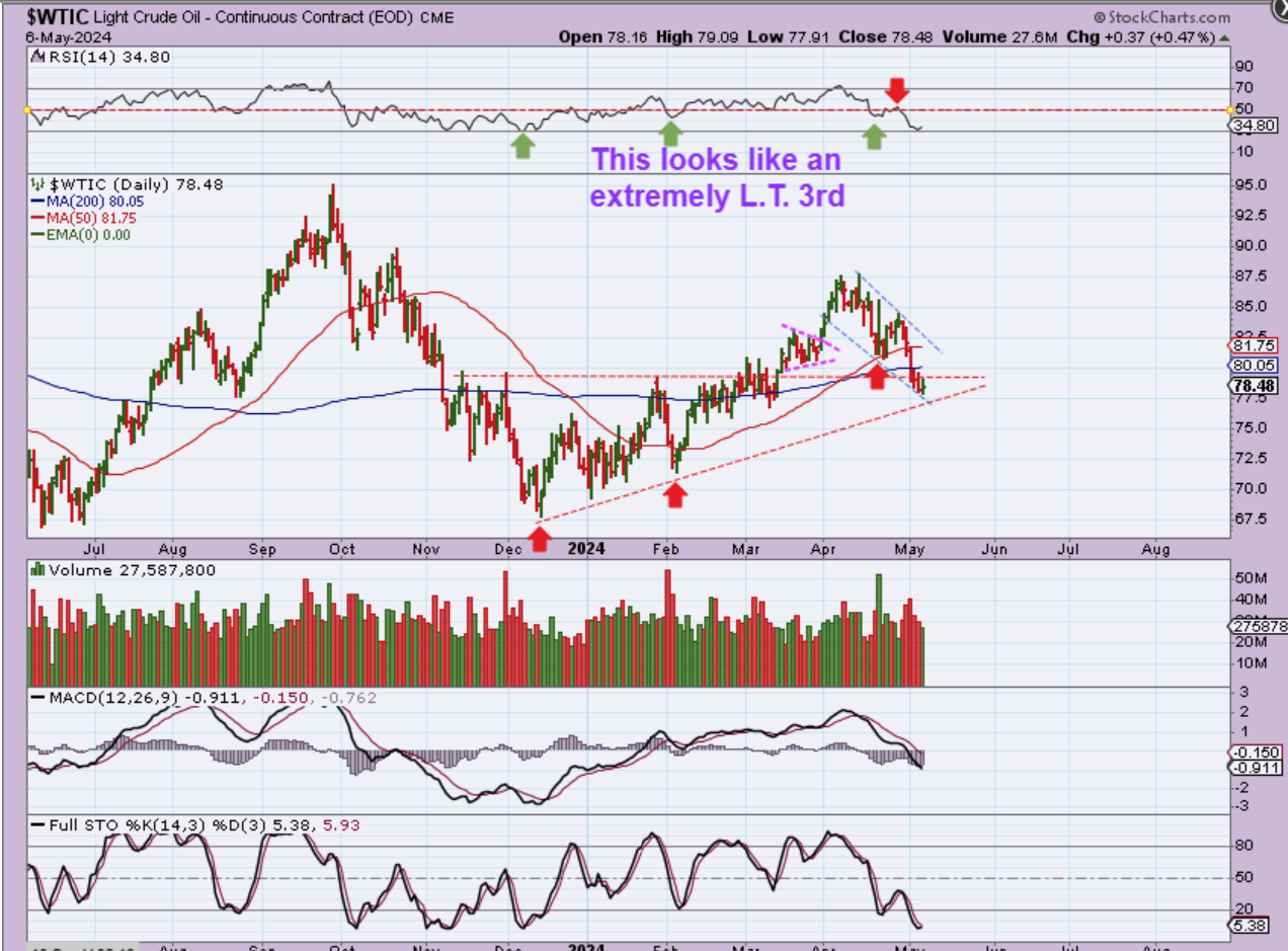 WTIC – Oil bottomed perfectly on the 50sma near the 50 day cycle count. Then we had that Fed Mtg where inflation was discussed as not being overly concerning and after Oil had bounced, it then rolled over and now looks very weak, as though a 3rd daily cycle formed as very L.T.  – There is a chance that we have a VERY long daily cycle in Oil and will form a dcl here, but I think that we may bounce and roll over at this point.  The Oil Stocks also look weak.