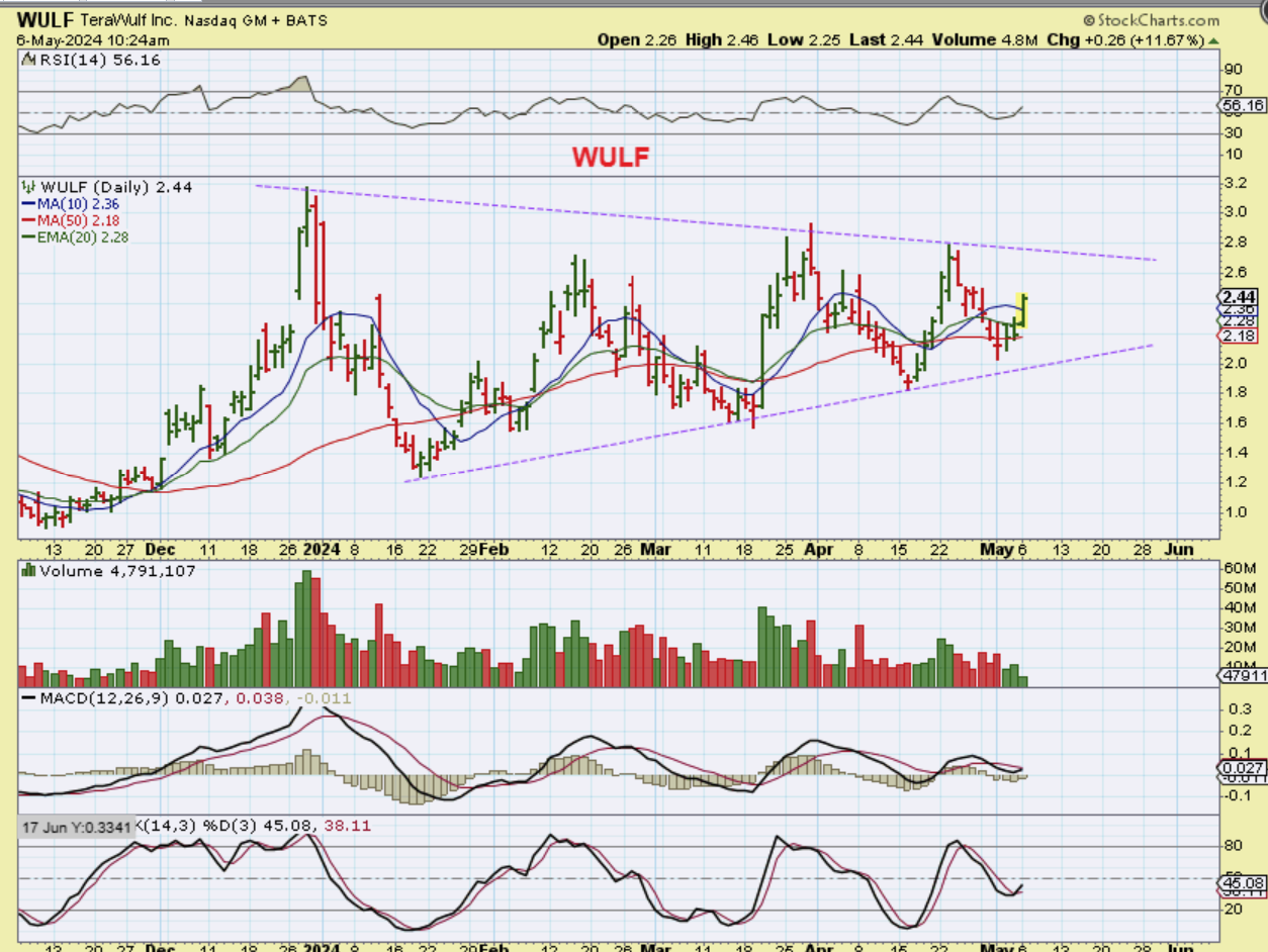 WULF has a series of higher lows and looks to be forming a large bullish triangle. Look at the chart of Bitcoin again above, and you’ll see day 42 was a lower low, and in WULF it was not. It is showing strength when Bitcoin sells off.