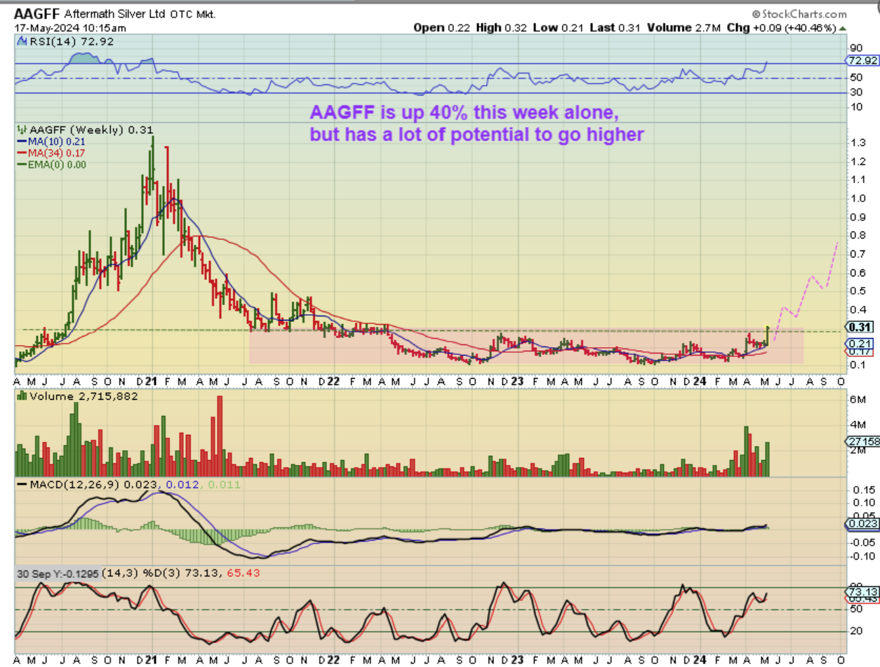AAGFF WEEKLY – AAGFF is breaking from a long 2 year base now, and a 40% gain for the week is great. In fact, the larger weekly pop 5 weeks prior to this week was also a 42% up week, so these are making great progress.