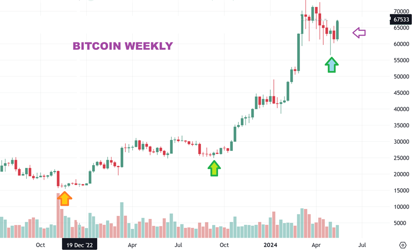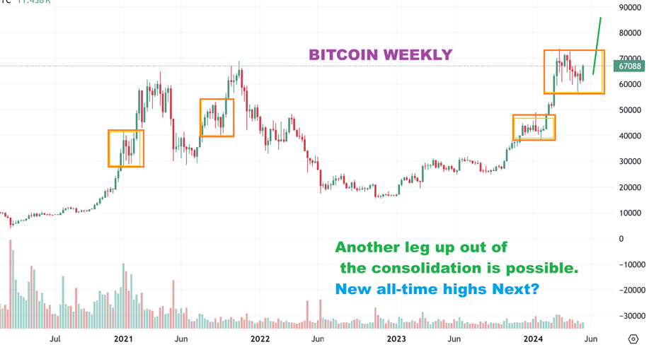 BITCOIN WEEKLY: It would now stand to reason that we could see another run higher. A measured move higher is ‘Roughly’ $92,000 if volume and strength comes into the sector. With the ETFS & big players now buying, this candle may trigger that buying.