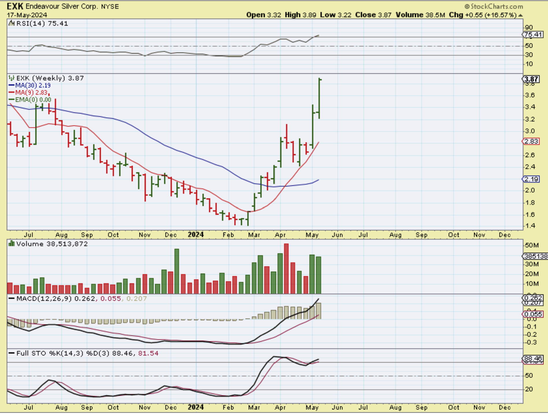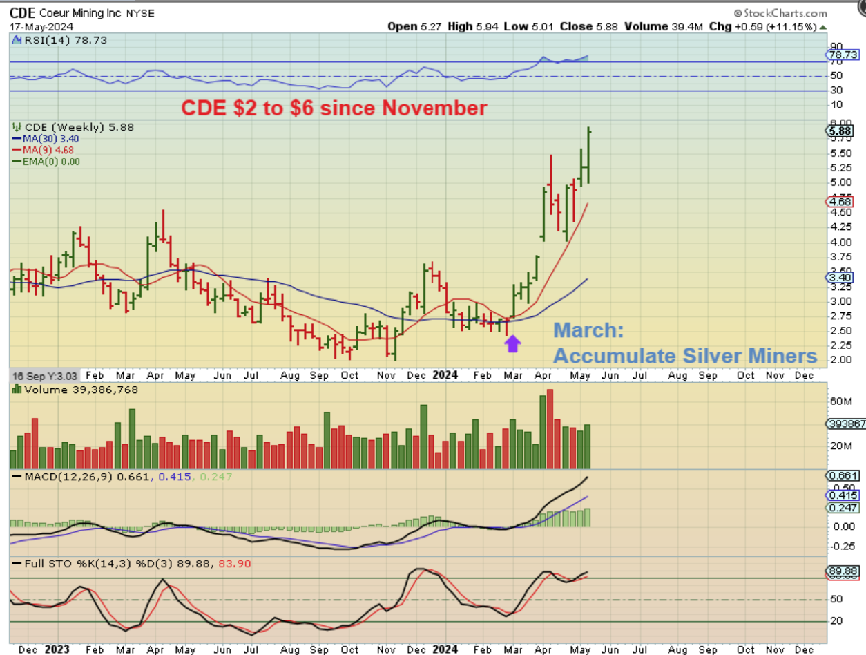 EXK was up 25% 2 weeks ago and 16.57% last week alone (40%), but from the March time period it has almost tripled!! If you had these in your basket and simply bought and held them, you are feeling pretty good about this sector. April was choppy when we dipped into the dcl heading to the fed meeting, but Silver stocks have SURGED since that meeting.
