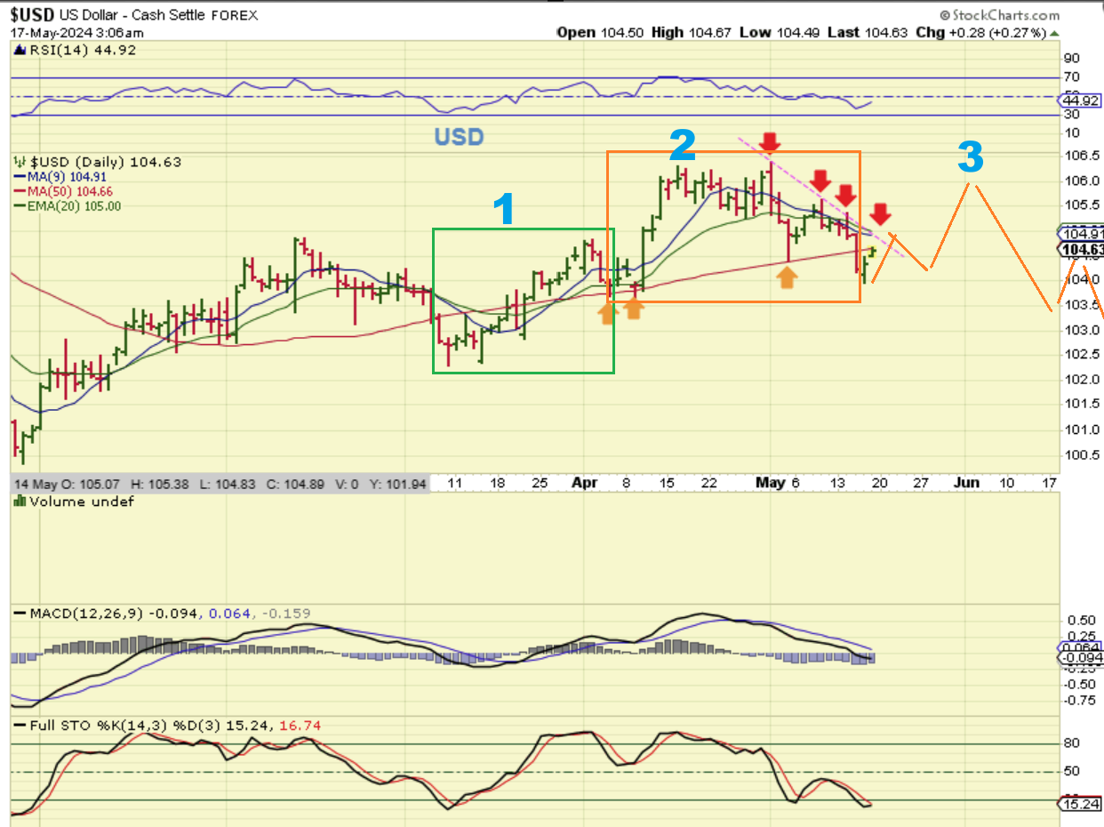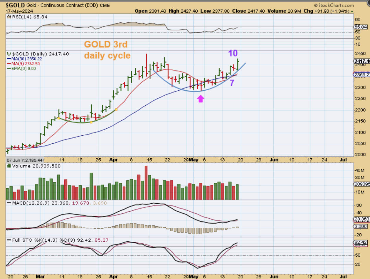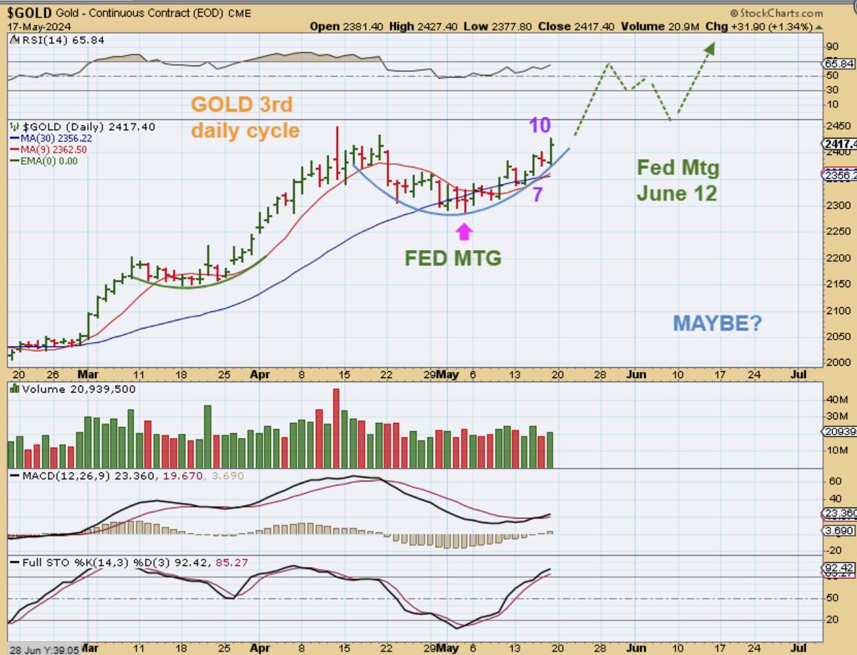You may recall that Gold was selling off into the May 1st Fed Mtg, but when he hinted that inflation was still manageable and then we also had the release of the CPI Numbers showing inflation dropped slightly, Gold has started to rise and formed the right side of this cup. That could continue until we get closer to the next Fed Mtg, due at June 12th. So as an idea or a guess, I drew a cup with a breakout and then a back test at the June Fed mtg. THIS is if the 3rd daily cycle forms as R.T. If it forms L.T., then we may see Gold get choppy after day 12 or 13 and chop sideways in to the fed day.
