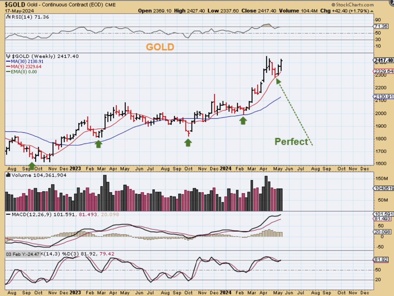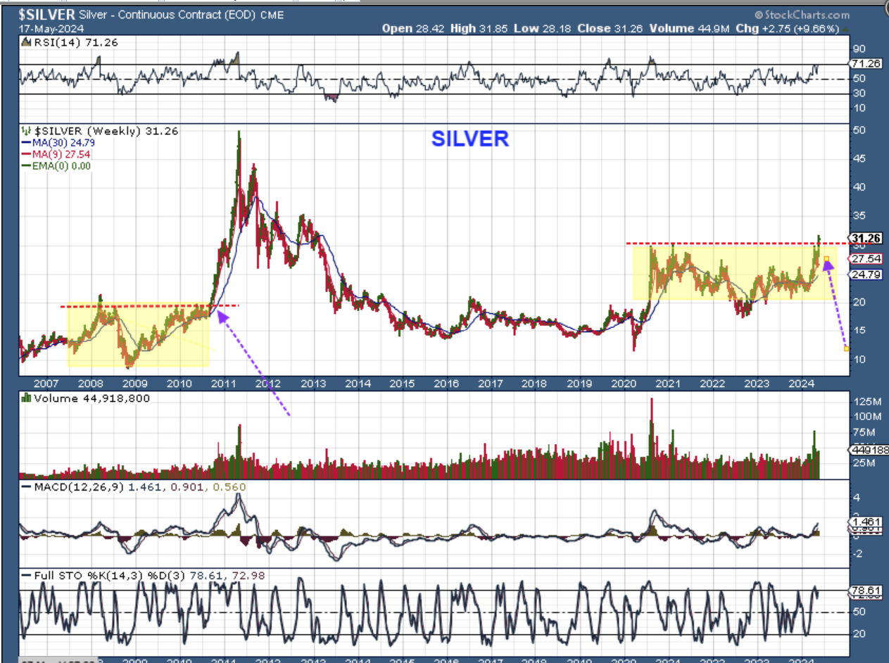 SILVER WEEKLY – I have been pointing out that the last time we saw a large consolidation from roughly 2008-2010 and Silver broke out from it, we saw a Moon Shot! Well, Silver is now above that $30 area and looks to be breaking out, so there is a chance that we could see acceleration now or after a back test this summer. Silver stocks did very well this week—-as expected!