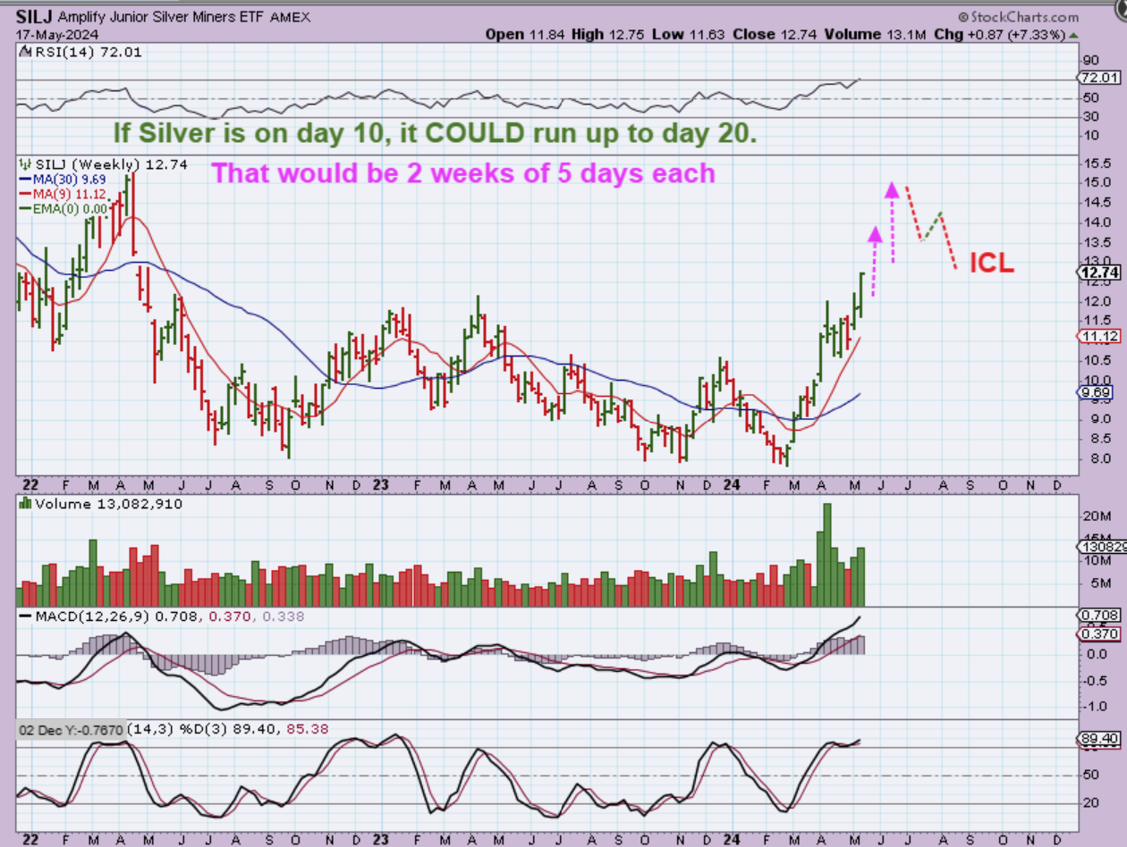 SILJ WEEKLY – SILJ has reached the overbought point on the weekly, but it could also continue higher for 2 weeks as shown here. Why do I say that? 2 weeks is only 10 trading days, and we are on day 10 for Silver. Please read the chart.