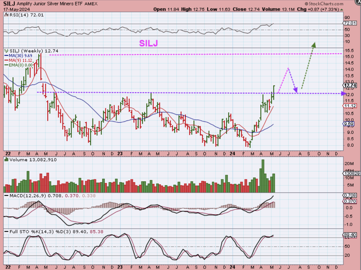 SILJ WEEKLY – Stepping back, we also see that SILJ actually just broke above the base. A quick rally to $15 could complete a run to the 2022 highs. I also drew a back test, since a dcl or eventually an ICL may cause a pullback.