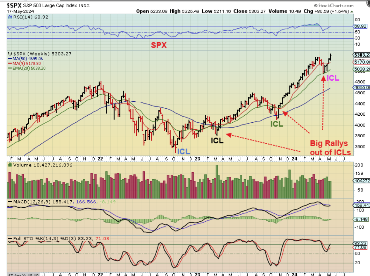 SPX WEEKLY – Our 3 week drop into an ICL landed and reversed right at the 20 ema. With an ICL I would expect at least 2 daily cycles that show strength, but the last 2 ICLS obviously showed strength for many weeks, as seen here. Everything mentioned here goes for the NASDAQ too, these remain bullish for now.