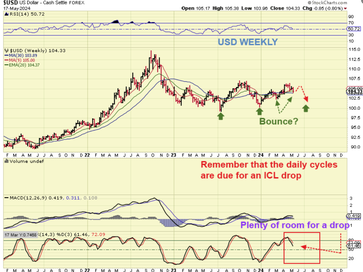 THE USD DAILY showed some weakness at the end of that 2nd daily cycle, especially after the Fed Mtg. I think that it can bounce in a 3rd daily cycle, and then it should weaken & roll over to new lower lows again.