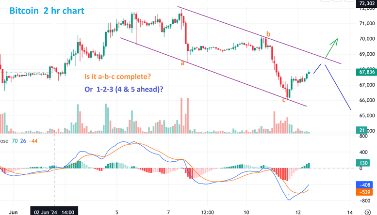 BITCOIN 2 hr chart: We saw a sharp drop followed by a sideways consolidation and then another sharp drop into Tuesday. That does look like an a-b-c complete and now the Fed Decision could cause a breakout rally, since we do have a good amount of time left, but yesterday I raised a thought about a long consolidation. THAT would mean that we are possibly seeing a 5 wave drop with 1-3 completed.