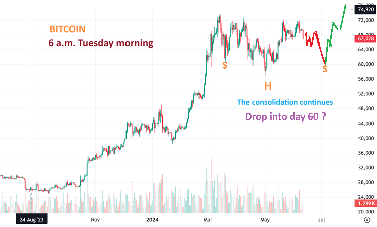 Bitcoin could form a massive inverse H&S pattern with the entire 60 day cycle. These are very bullish longterm, but riding it down to a day 60 drop from here would take a couple of weeks and could cause the crypto related stocks to drop considerably, so I wanted to point this out as Bullish, but short term difficult or painful. I don’t know if this will happen or not, but the possibility exists.