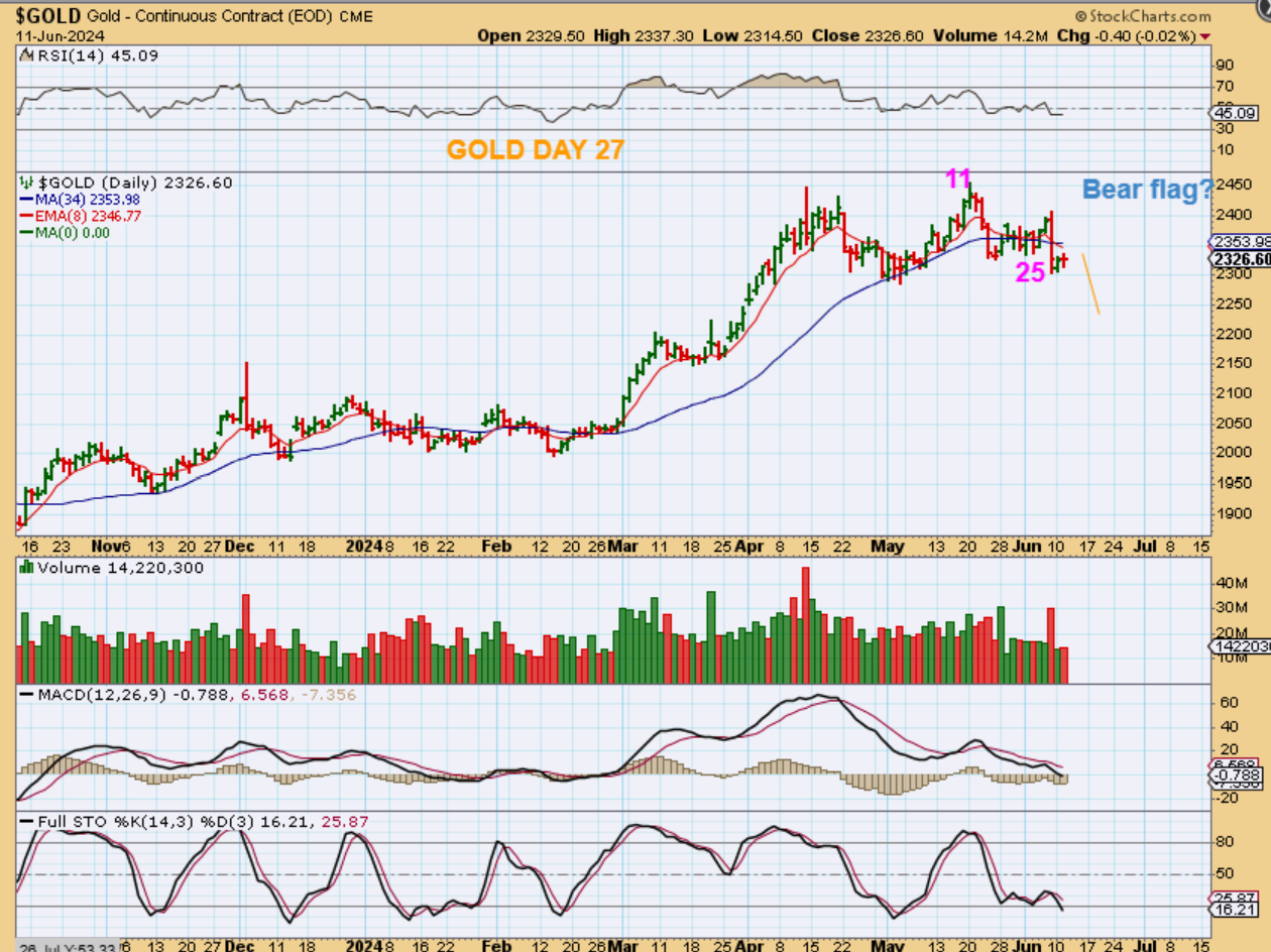 GOLD could be crawling to form a ‘bear flag’ as we head into the Fed. That slam down MIGHT be a dcl on day 25, if the Fed Speech sends this higher, but it is risky here with a weak MACD and RSI. Gold is due for a dcl and …