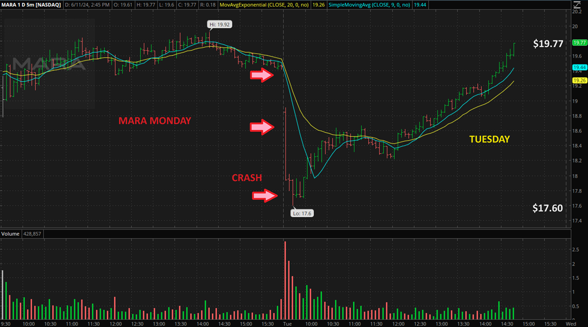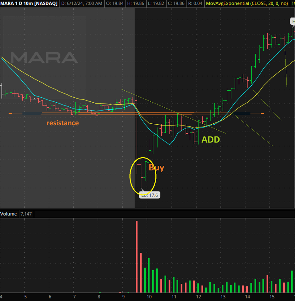 MARA 10 minute chart: I posted this in the comments to show that slam down and then the move higher was from $17.60 to $19.77. That is a $2 move/share. To be honest, No one can really catch the $17.60 low, but even $18 or $18.50 to $19.77 is $1.50 or $1 / share. Buy 1000 shares, get $1000 to $1500 as a day trader. The good thing was that these recovered smoothly. Sometimes you get stopped out, but yesterday was an exhaustion slam down and most sellers were out, so it ran smoothly with buyers.