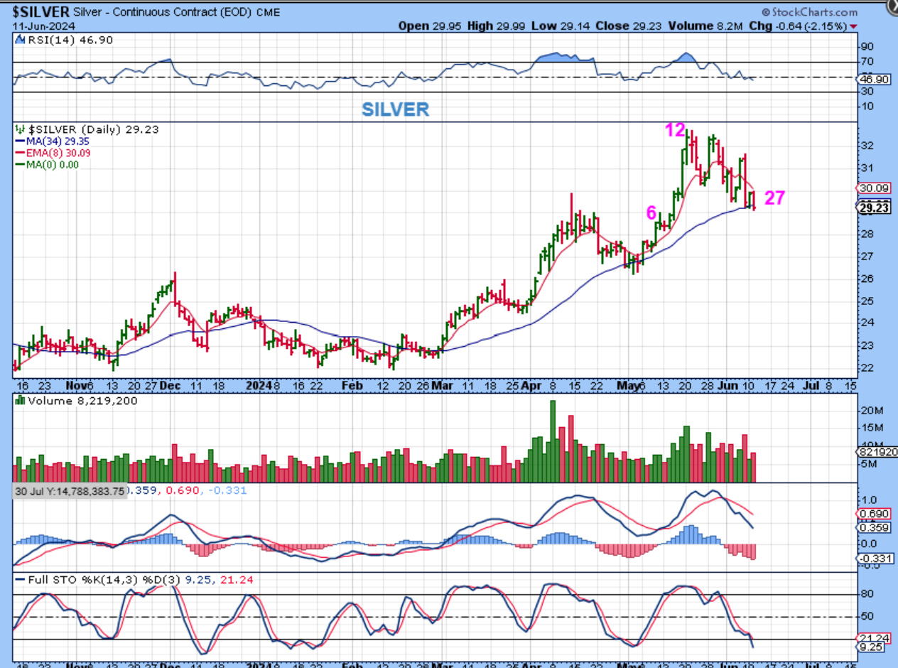 SILVER reversed on Monday day 26 at the 34 sma, but it rolled over to a new low on Tuesday. Silver is finally reaching oversold, but on day 27 it could also drop lower.