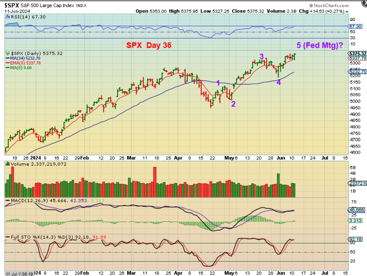 “Is this fifth leg up complete?” Could that 5th leg extend? Yes, and since it is day 36, it could also continue a little higher due to that cycle count. We have had 50 day daily cycles in the past. That being said, we must conclude that we are due for a drop now or very soon.