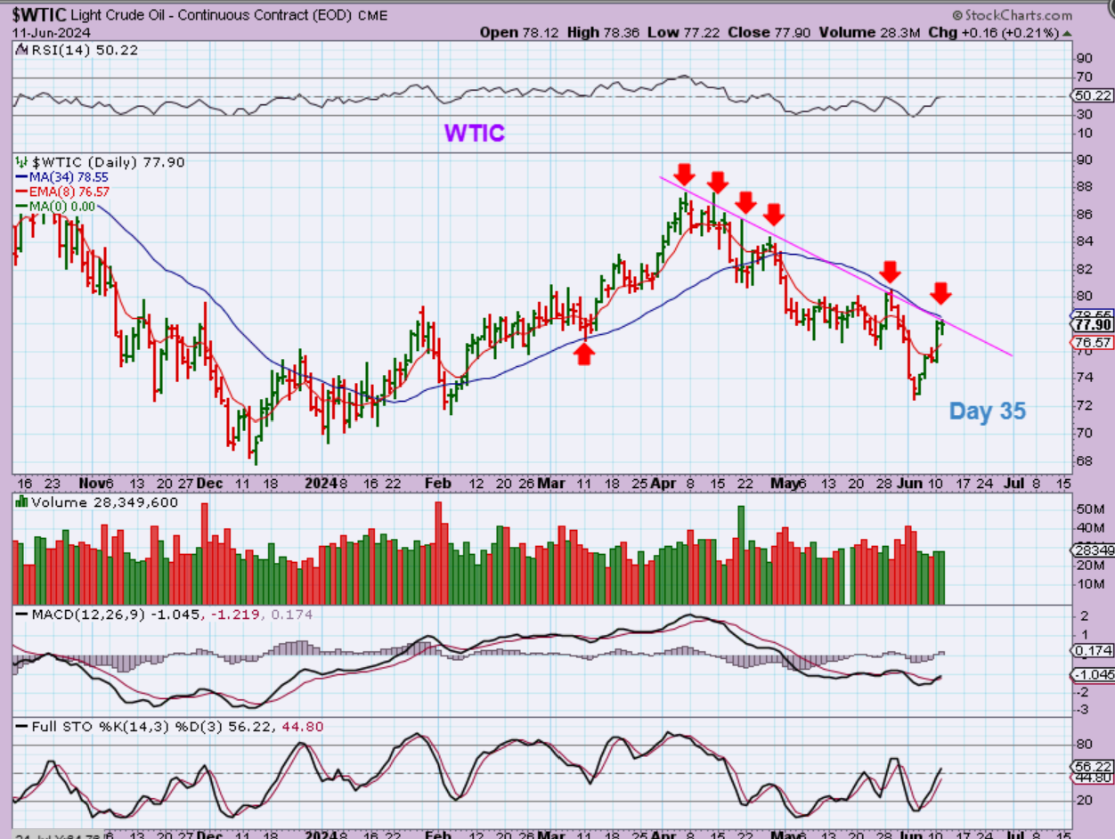 WTIC -Oil is at the resistance of a downtrend and the 34 sma. On day 35, this can chop & drop for 10-15 more days. Some like to use DRIP to short it, but it is choppy and may not be worth the trouble.