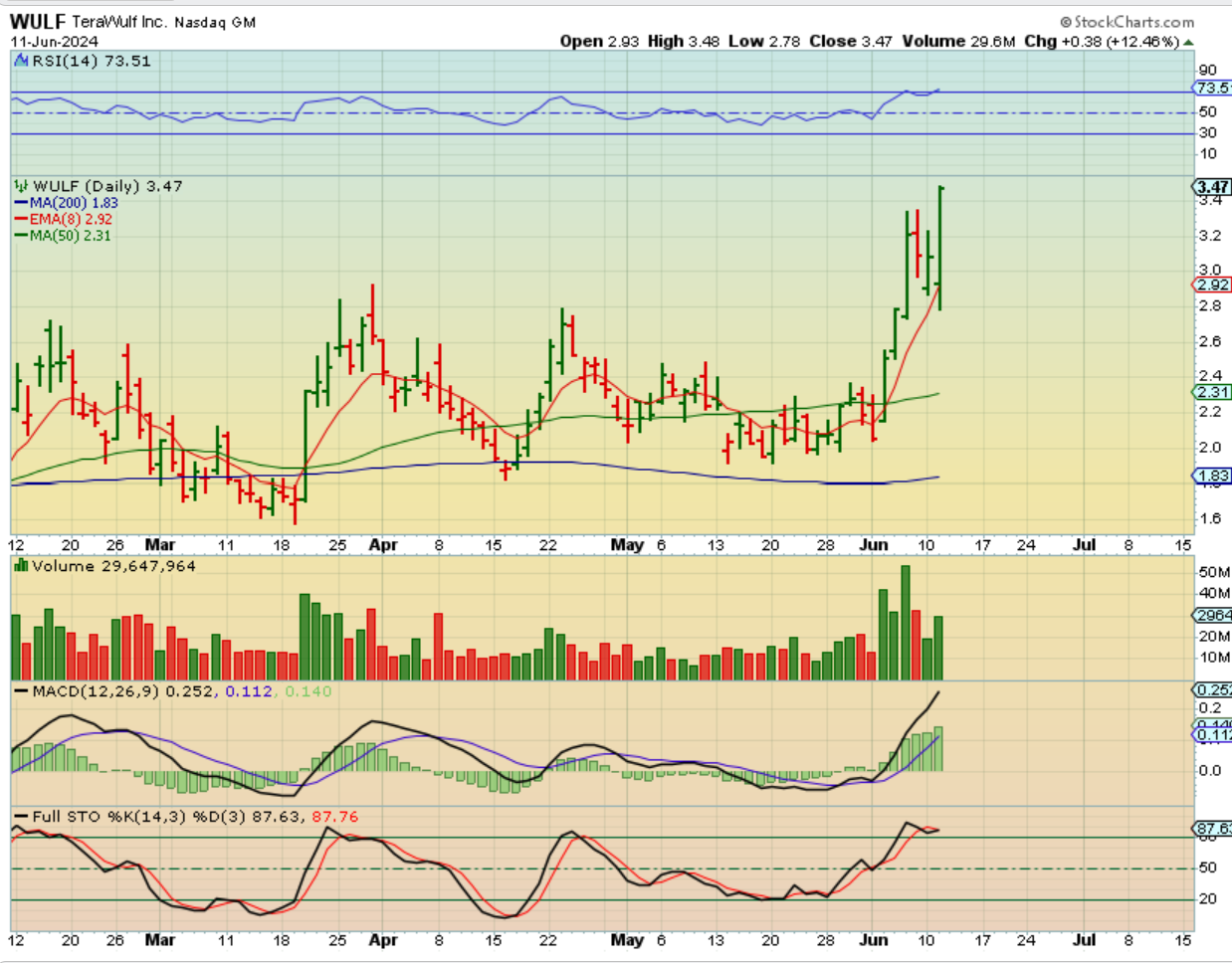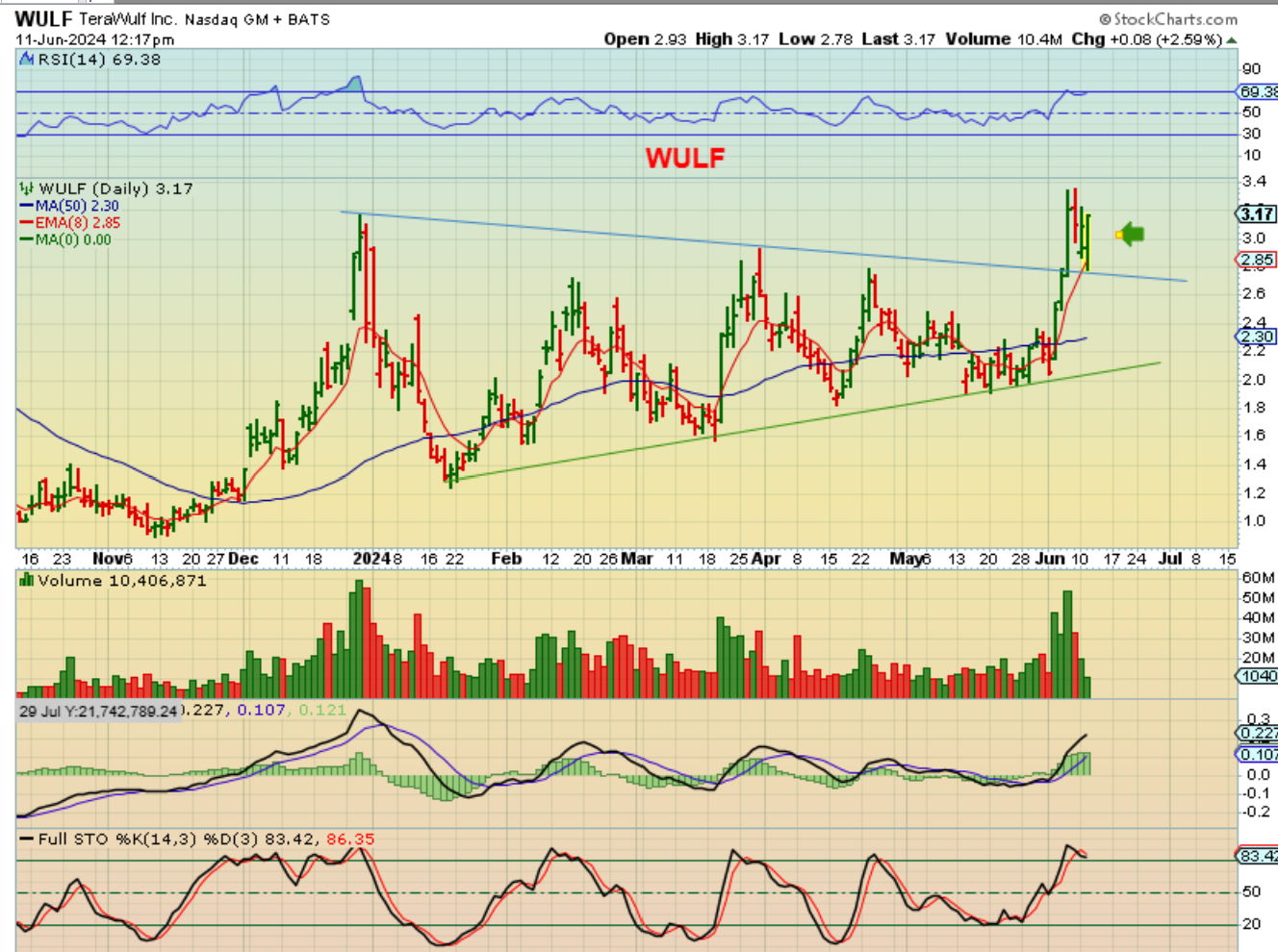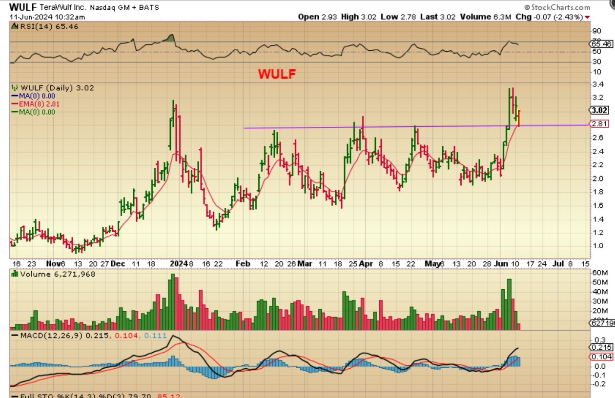 WULF – I pointed out WULF as a reversal after 1/2 hr too. It was down 7% or so and here it was still down 2.5% and a recersal at the 8 ema is buulish.