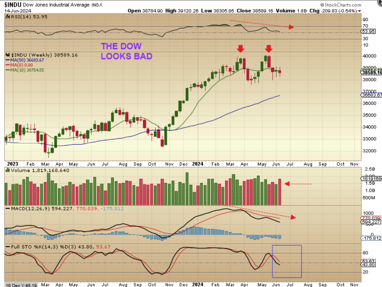 That said, The DOW JONES INDUSTRIAL AVERAGE has a double top with divergence, it had a red week, and looks ready to continue to limp along or sell down even deeper. We keep this in mind and keep an eye on things for the second daily cycle in the SPX and NASDAQ, to see if the weakness becomes contagious with the Dow Theory in play.