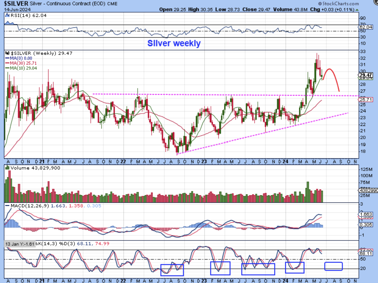 GDX – The Miners also peaked and I drew something similar to this last week to show the resistance overhead too. We need to allow ‘time’ to bring the price of the miners down to where they will put in their next ICL. That will be a major buy for another run higher and a breakout & run from this pattern.