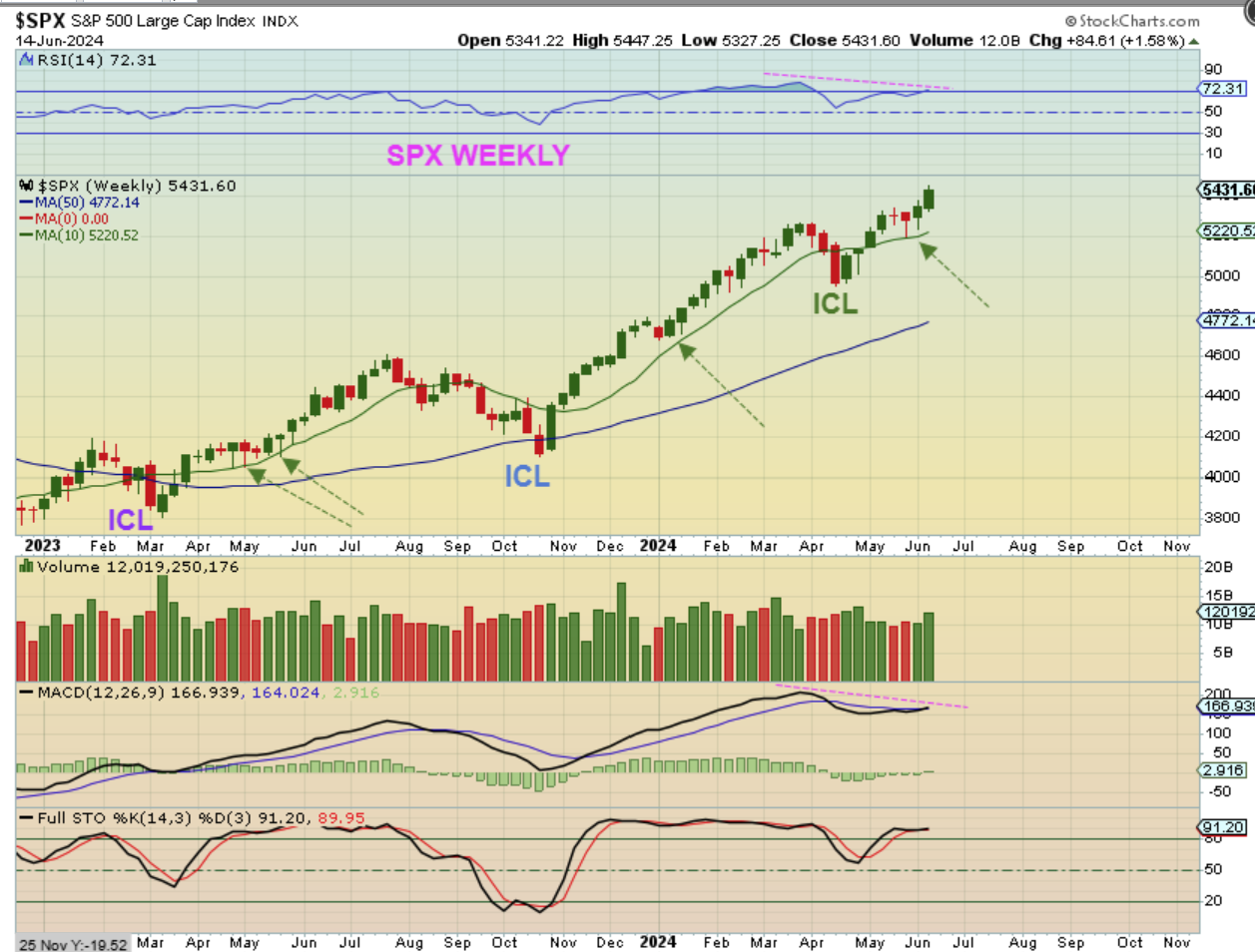 The SPX Weekly shows us that we had another nice week ( a Fed Week) For the General Markets and the Bull Run continued to new all-time highs. They like the news of a rate cut still in the works, and inflation dipping lower.