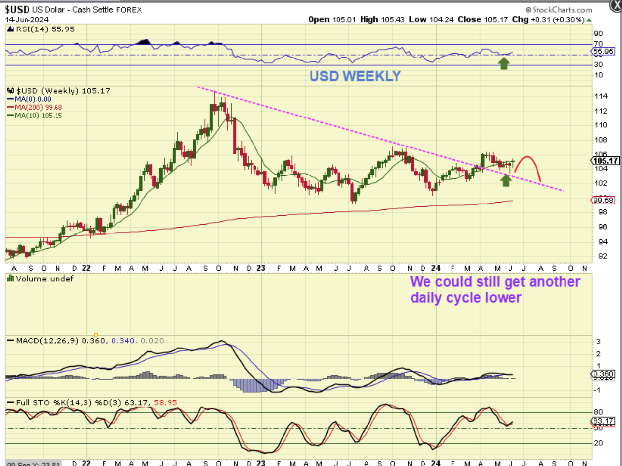 USD WEEKLY: So the USD Daily did not break even higher, but on the weekly we did see it break a long term downtrend. Another daily cycle lower could back test the trendline, but we’ll just have to let this play out further to see if we have weakness and another daily cycle lower, or strength and more of a push higher.