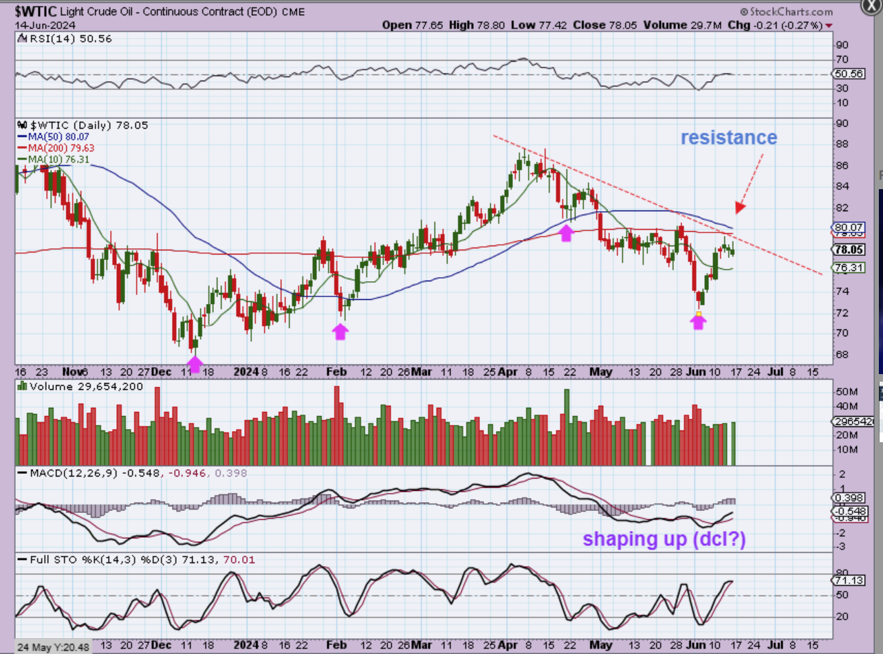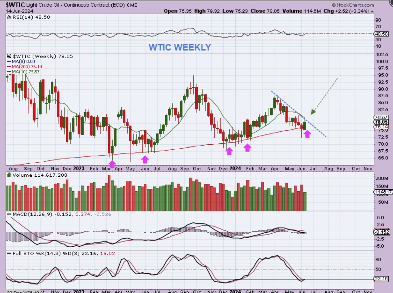 The Weekly WTIC Chart shows Oil at a support area though. A push higher above the 10 week ma & downtrend line would signal that an ICL already took place with that weekly reversal candle & dcl at the recent low.